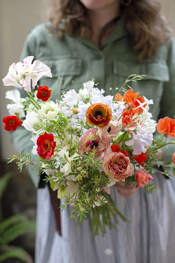 As fortune would have it that very week the studio had been asked to create the flower decorations for Vanessa and Reuben’s wedding. Vanessa’s initial reference image was of a poppy-strewn wildflower meadow with pops of scarlet red and cornflower blue. As we gathered buckets of cheery red geums, pale blue sweet peas, flax flowers and wild grasses, the timing of the moment wasn’t lost on the pickers and several days later an ecstatic bride messaged her thanks.