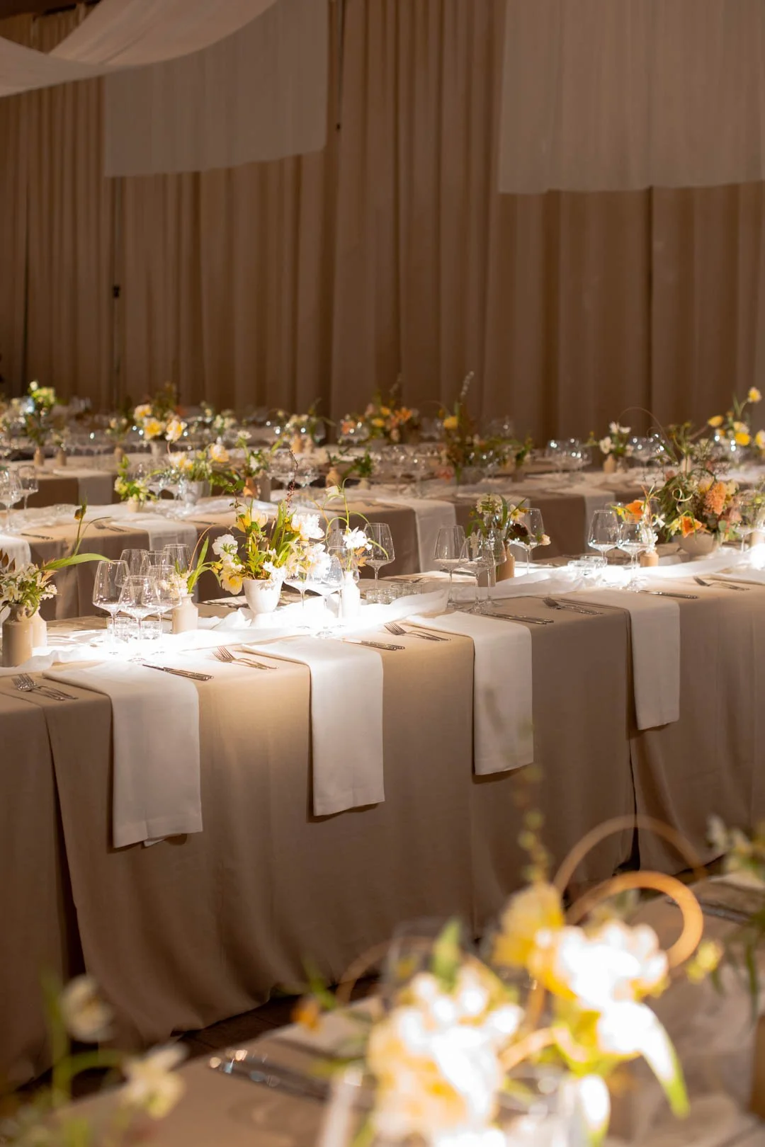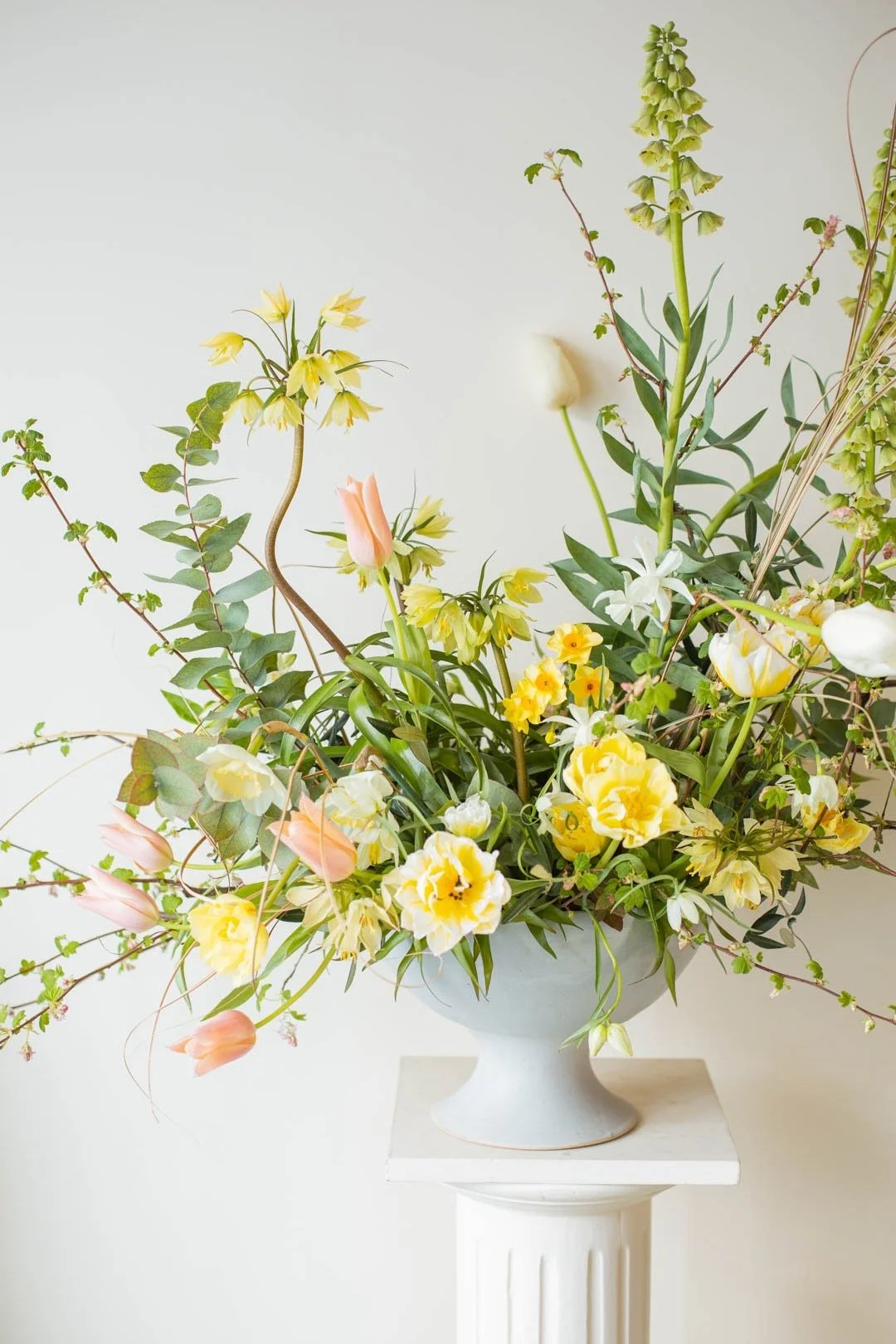 A large bowl of flowers and foliage for the escort card table - including the first Fritillaria raddeana from the garden. We used a colour palette of cool white, pops of golden yellow and green, with small touches of soft peach and honey hues for added warmth.