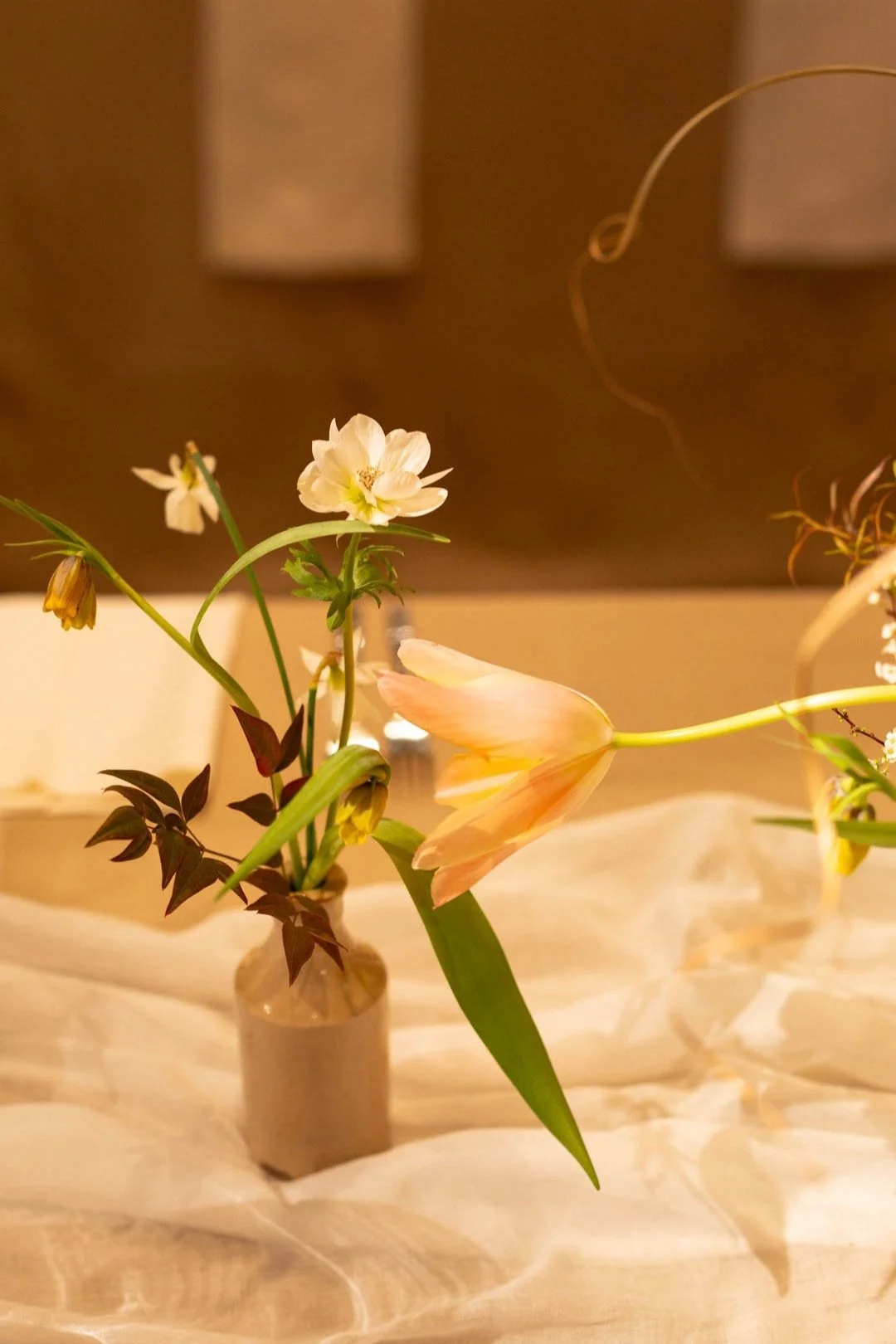 Vessels of mixed heights and shapes ran the length of the tables at Battersea Arts Centre with intricate, gestural designs of anemones, fritillaries and scented tulips in stoneware bottles and ceramic vases.