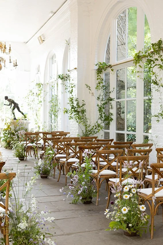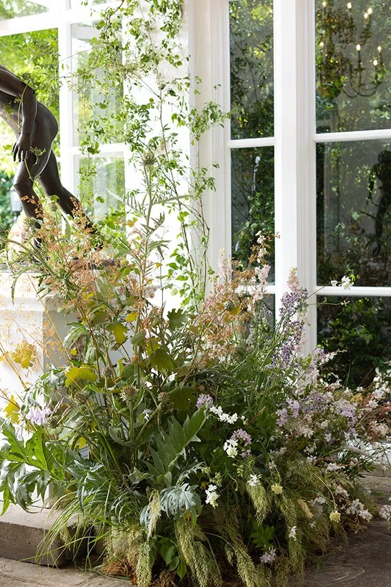 Formerly used as a ‘garden ballroom’, the tall windows and white walls of the Orangery provide a brilliant backdrop for flower dressing. We decorated the space with tall, wiry branches and trailing vines to bring the outside in.