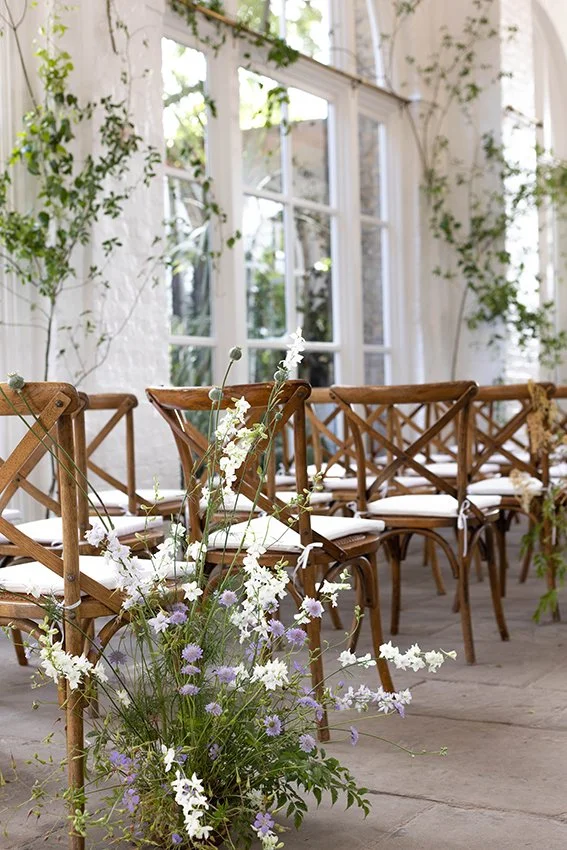 For the aisle flowers, small groupings of delicate stems at the base of the chairs - above a combination of lilac-blue field scabious, pale delphiniums and poppy heads.