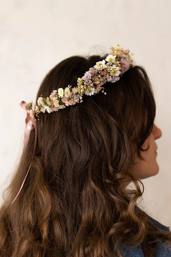 A delicate, textural flower crown of dried limonium, everlasting flowers and quaking grass tied with a silk ribbon.