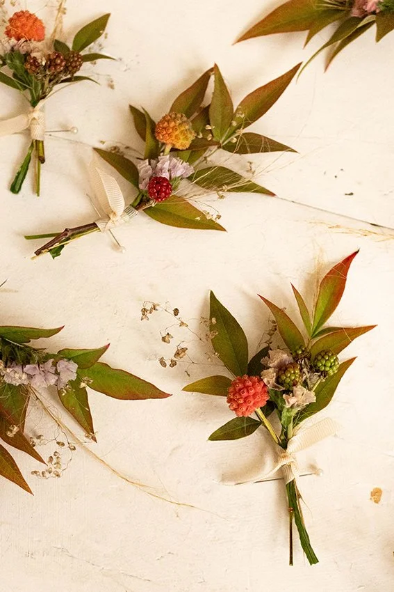 Buttonholes for the boys - Nandina foliage tipped with red, textural berries from a flowering dogwood tree, blackberries (again!) and grasses.