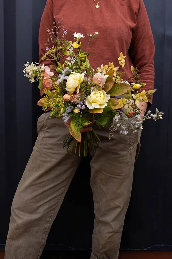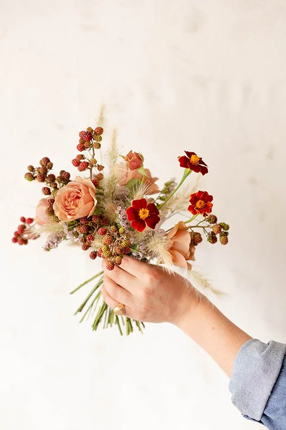 A simple, sophisticated bridal bouquet of massed ingredients - coffee roses, unripened blackberries, mauve-grey limonium, fluffy grasses and pops of red from three Tagetes ‘Burning Embers’.