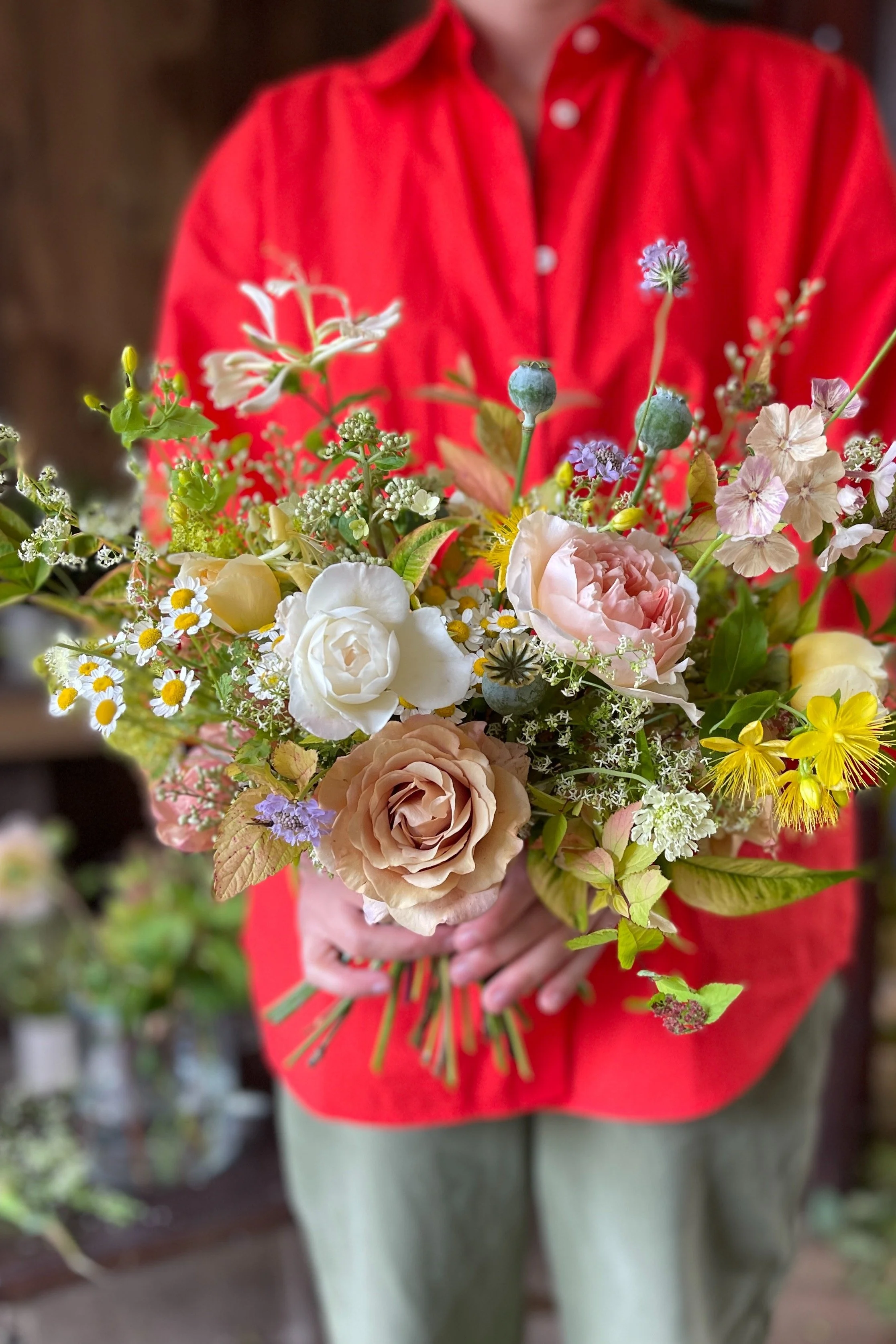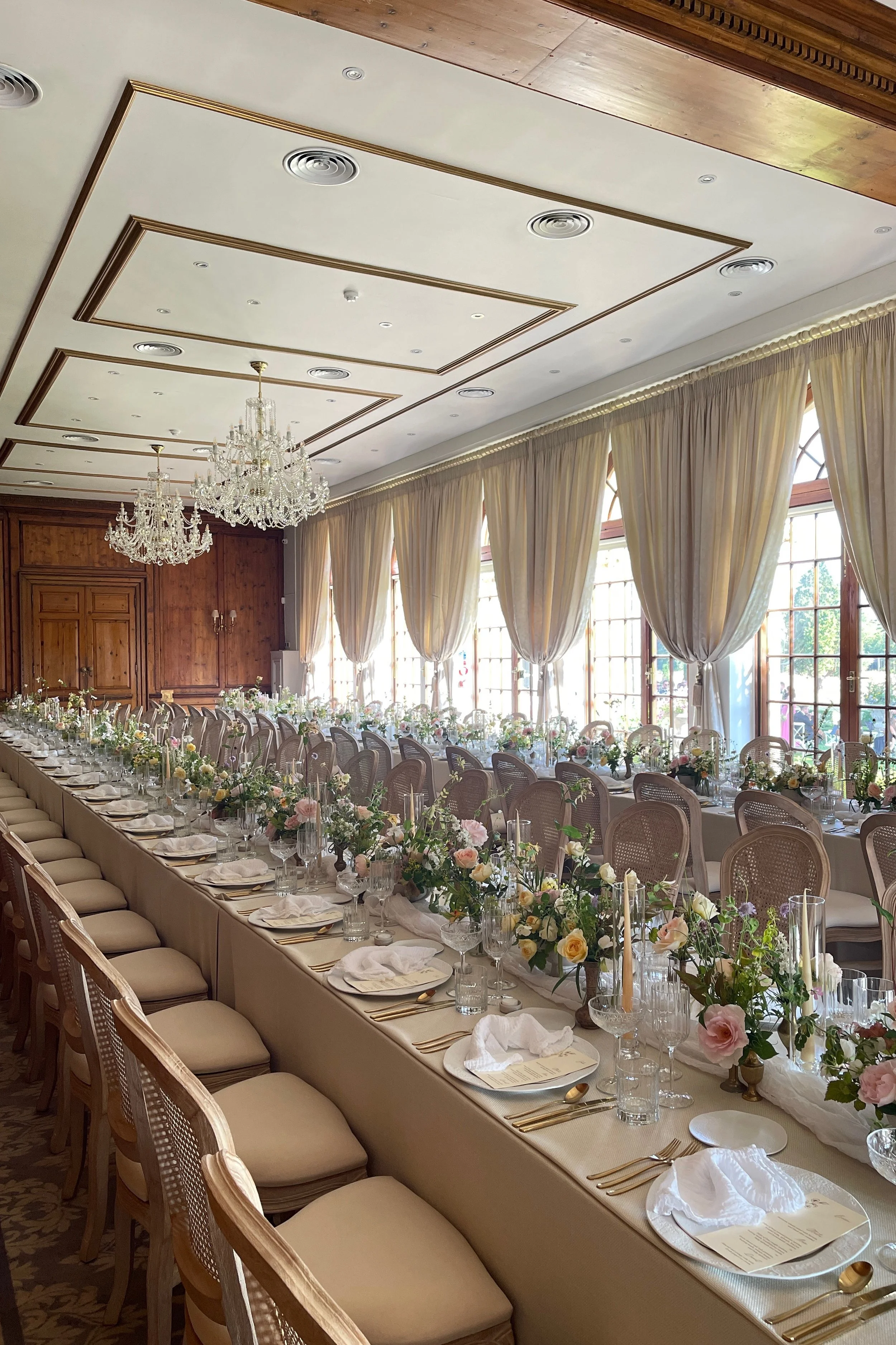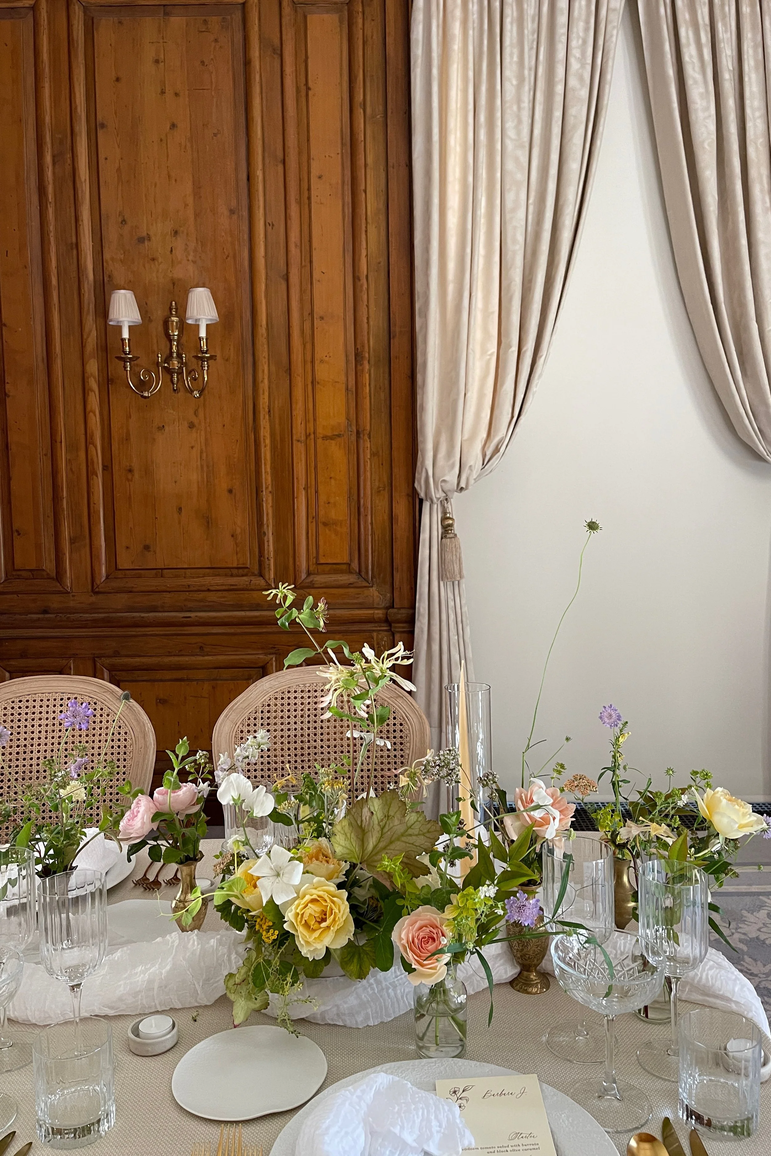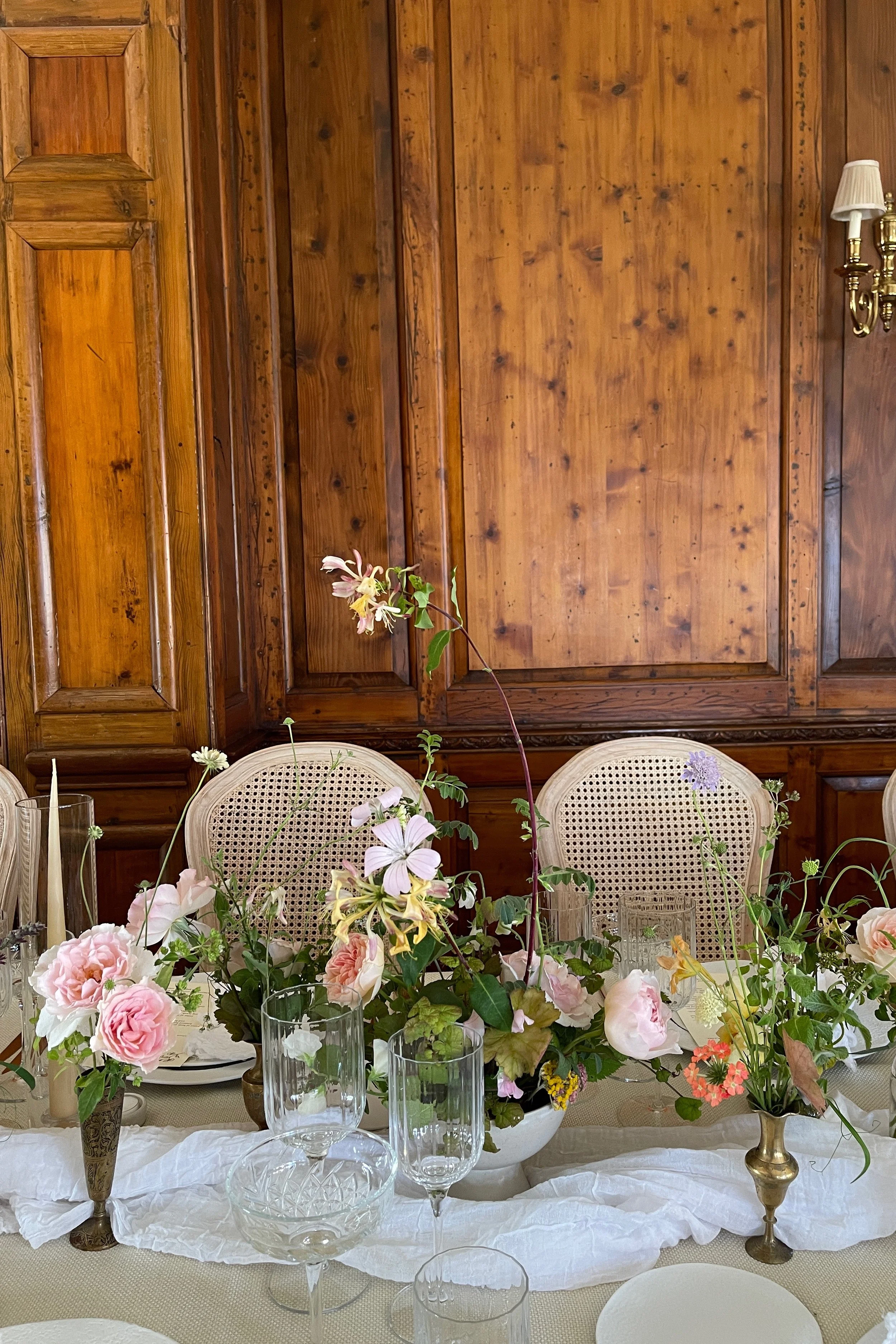 We made the tables luxuriously laden with a continuous stream of flowers the full length, arching vines of honeysuckle, tiny perennial foxgloves, blush, apricot and pale lemon roses among the candles and glassware. Just as the guests were coming in for dinner, it must have been about 8pm, I snuck a glimpse of the room with all the candles lit and the sunlight beginning to soften, the peach roses glowing. It was all very warm, very scented, very romantic!