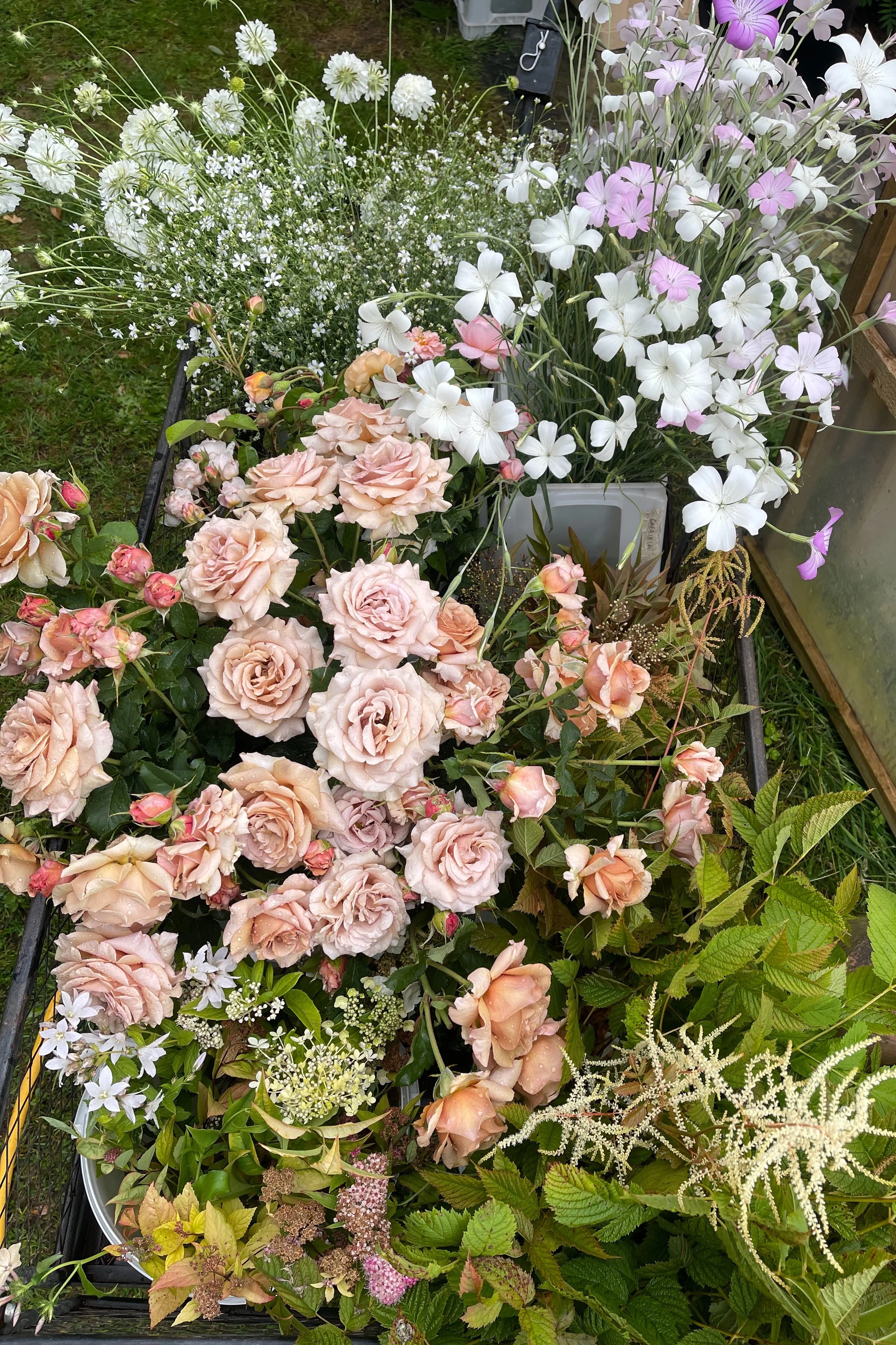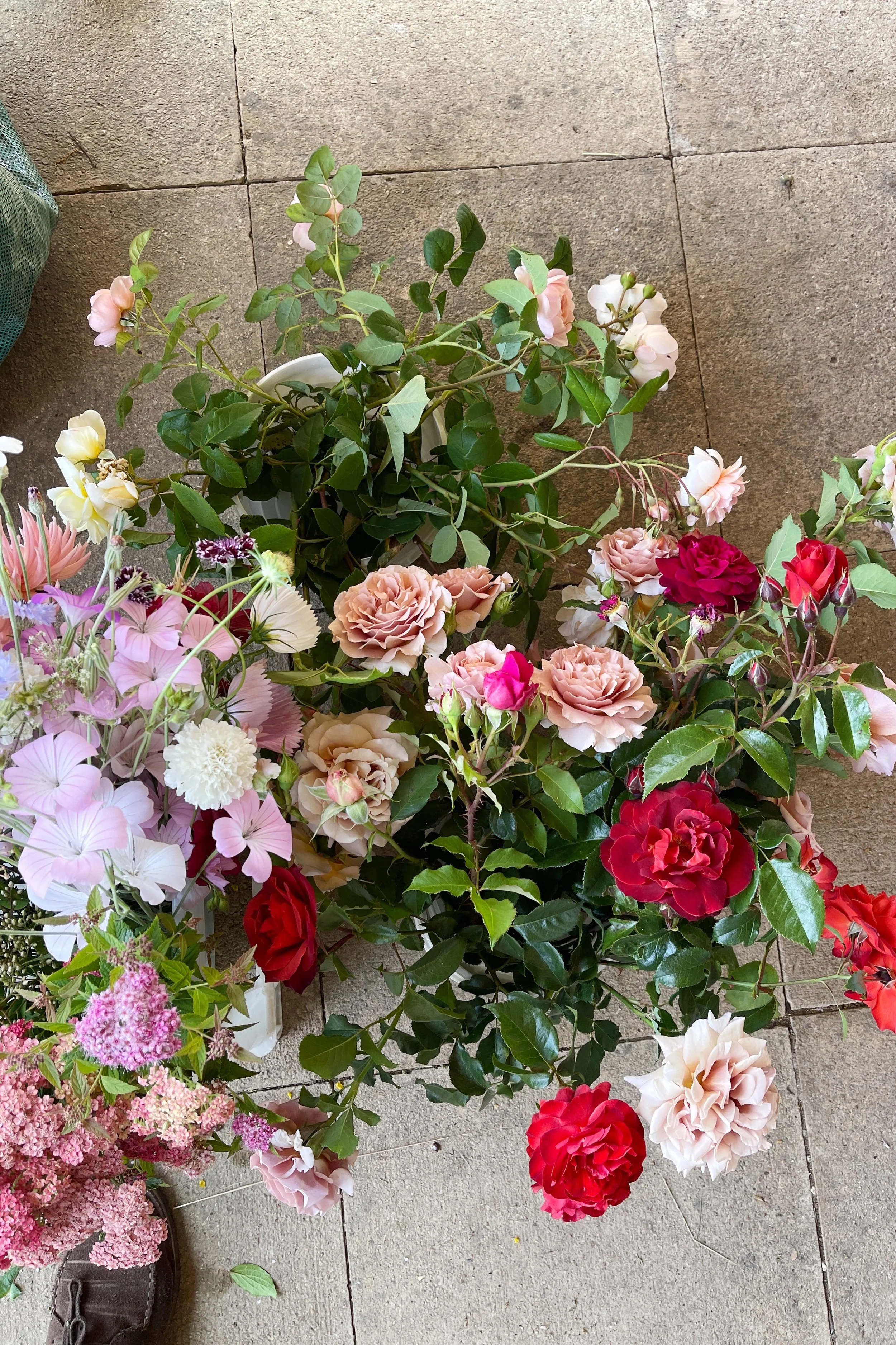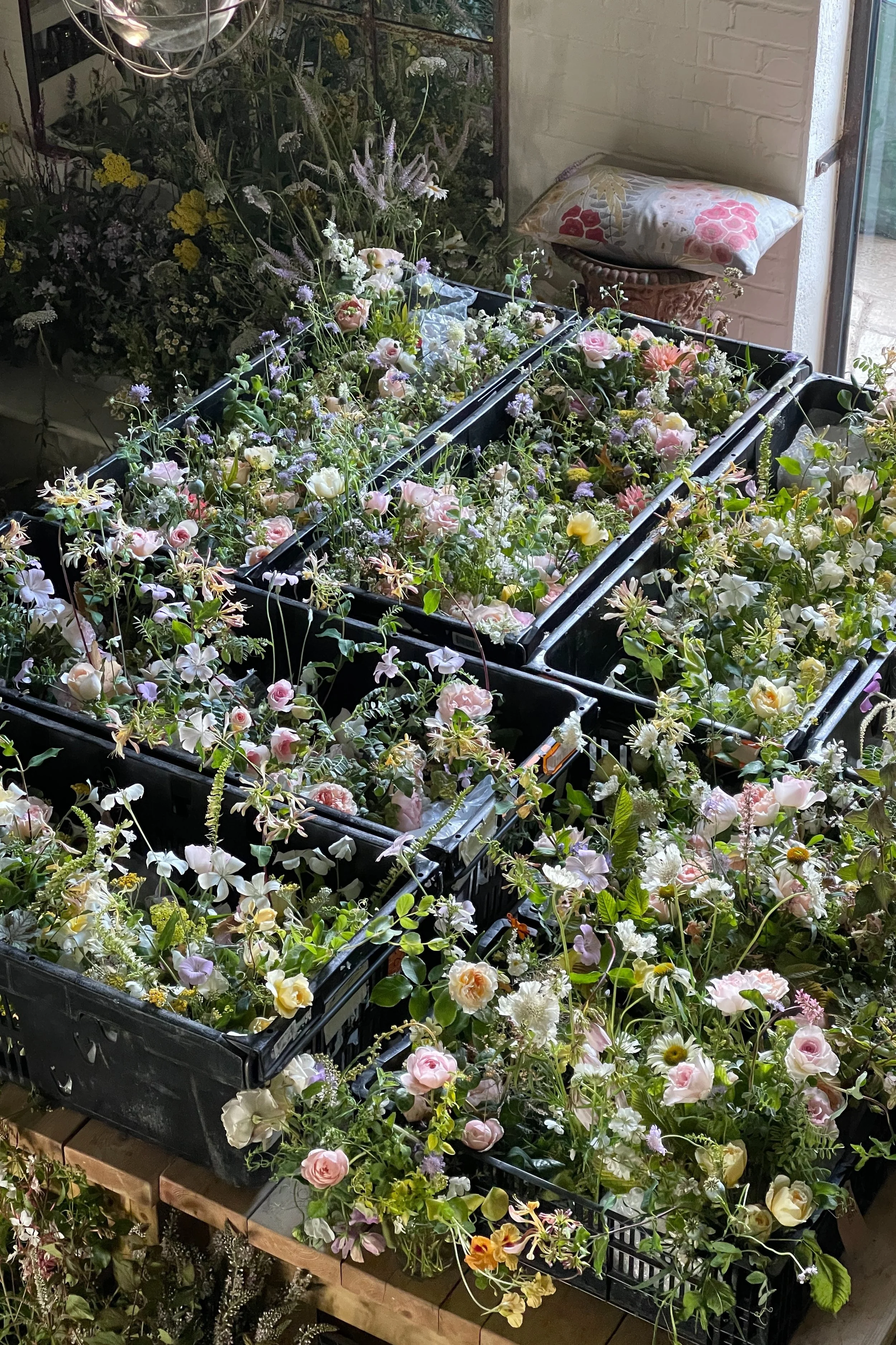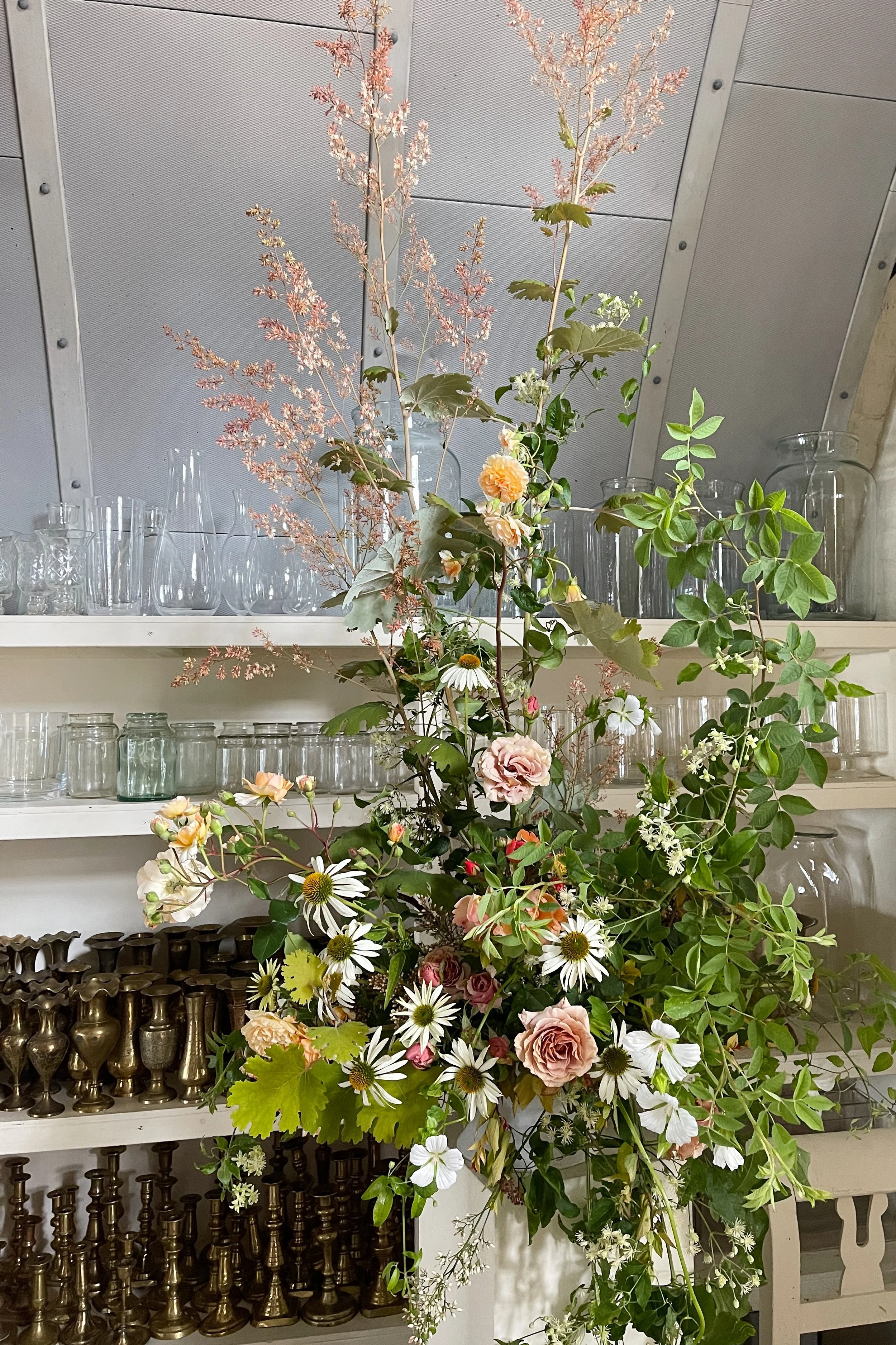 Early in the month we installed a wedding at Hedsor House for which - for once - it was a balmy 28 degrees and very windy. The ceremony was held outdoors in a small topiary garden for which we created an undulating floral border of perennials and garden roses. In the hall we wound spindly leafy branches up around the columns with honeysuckle and sweet pea vines entwined around them.