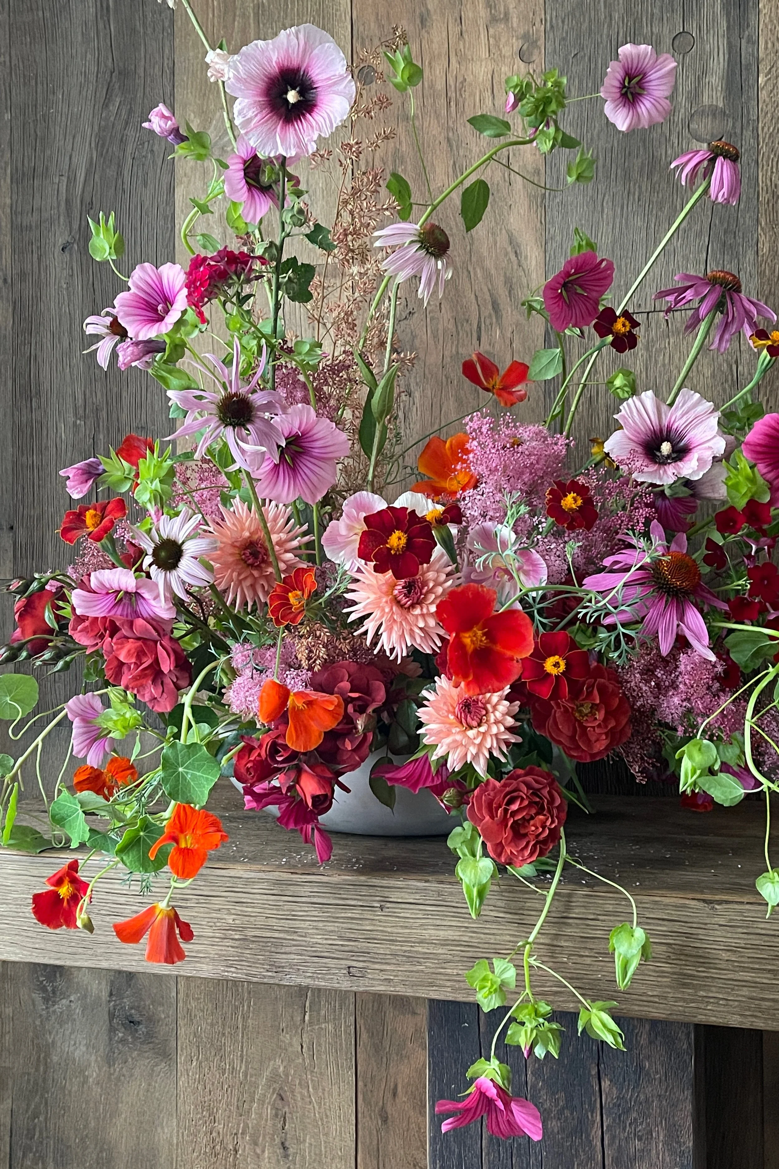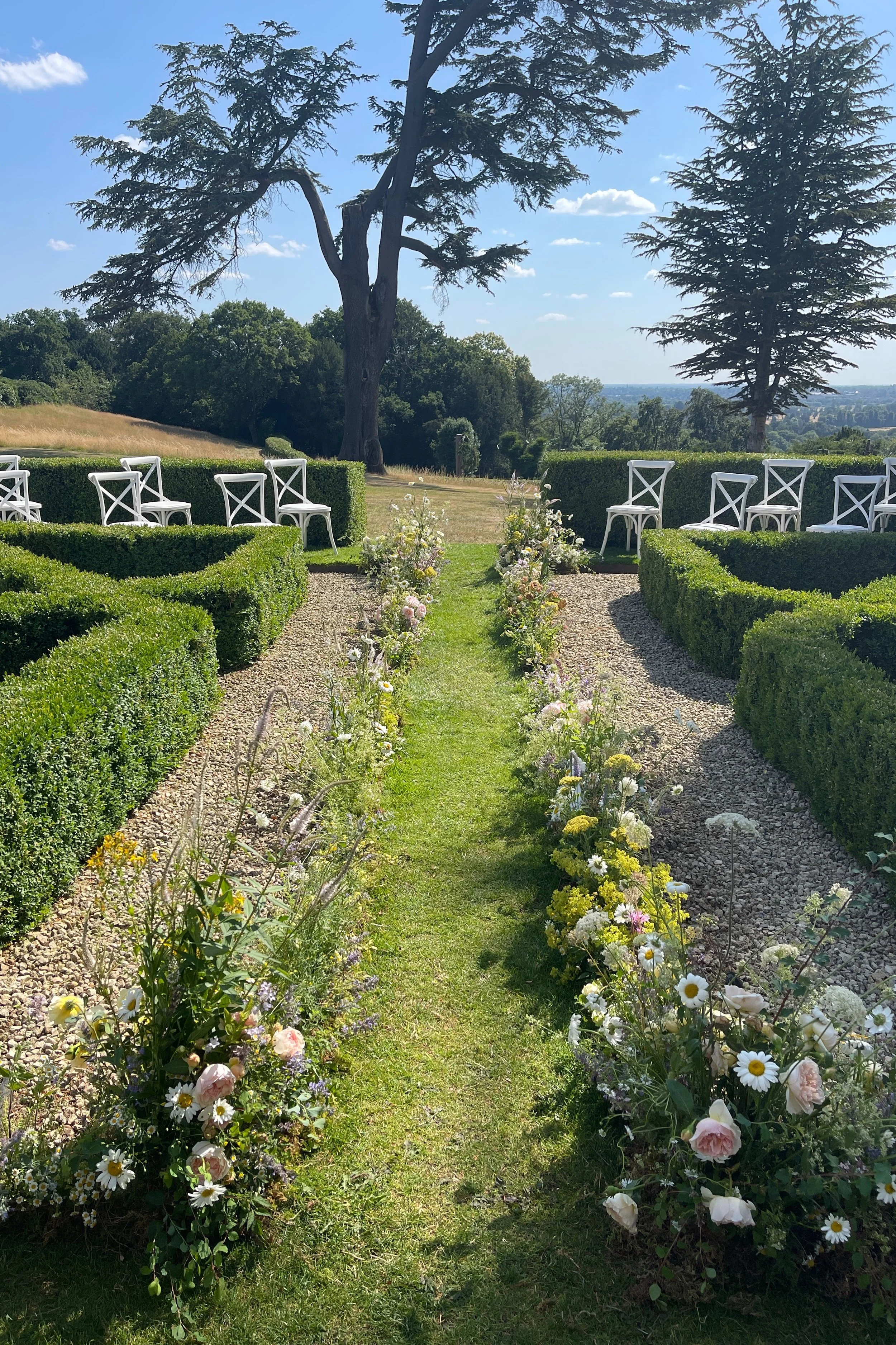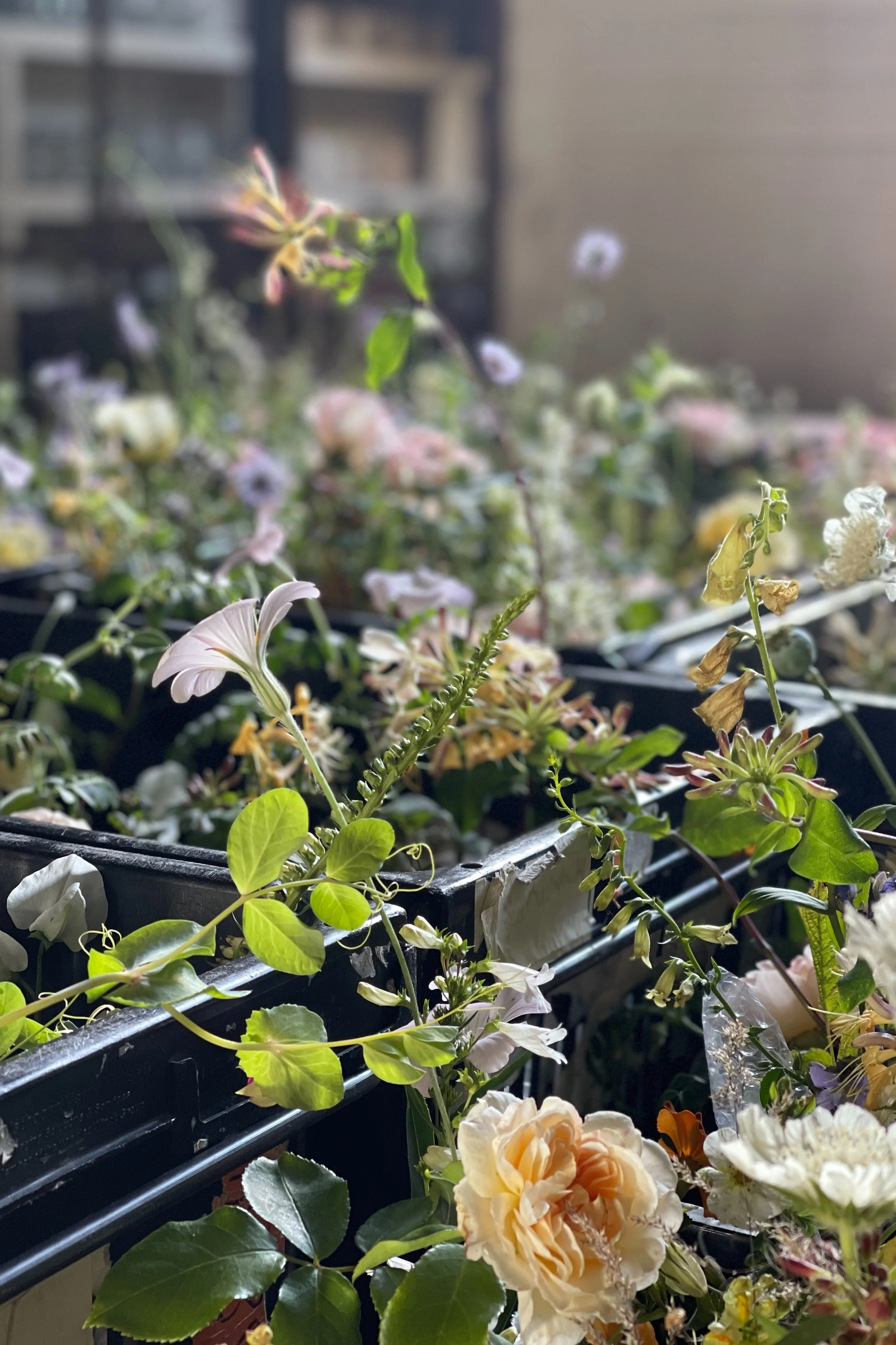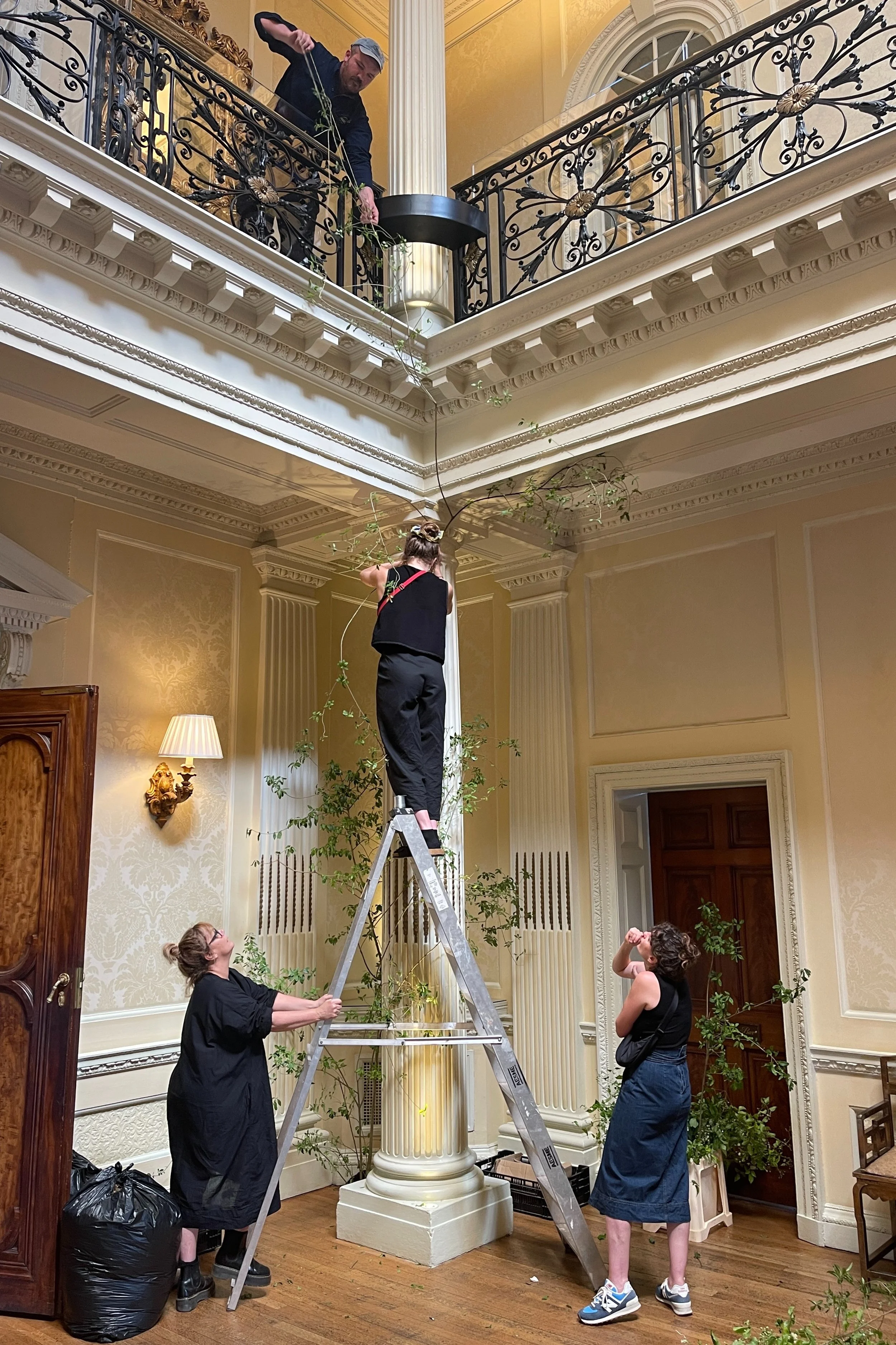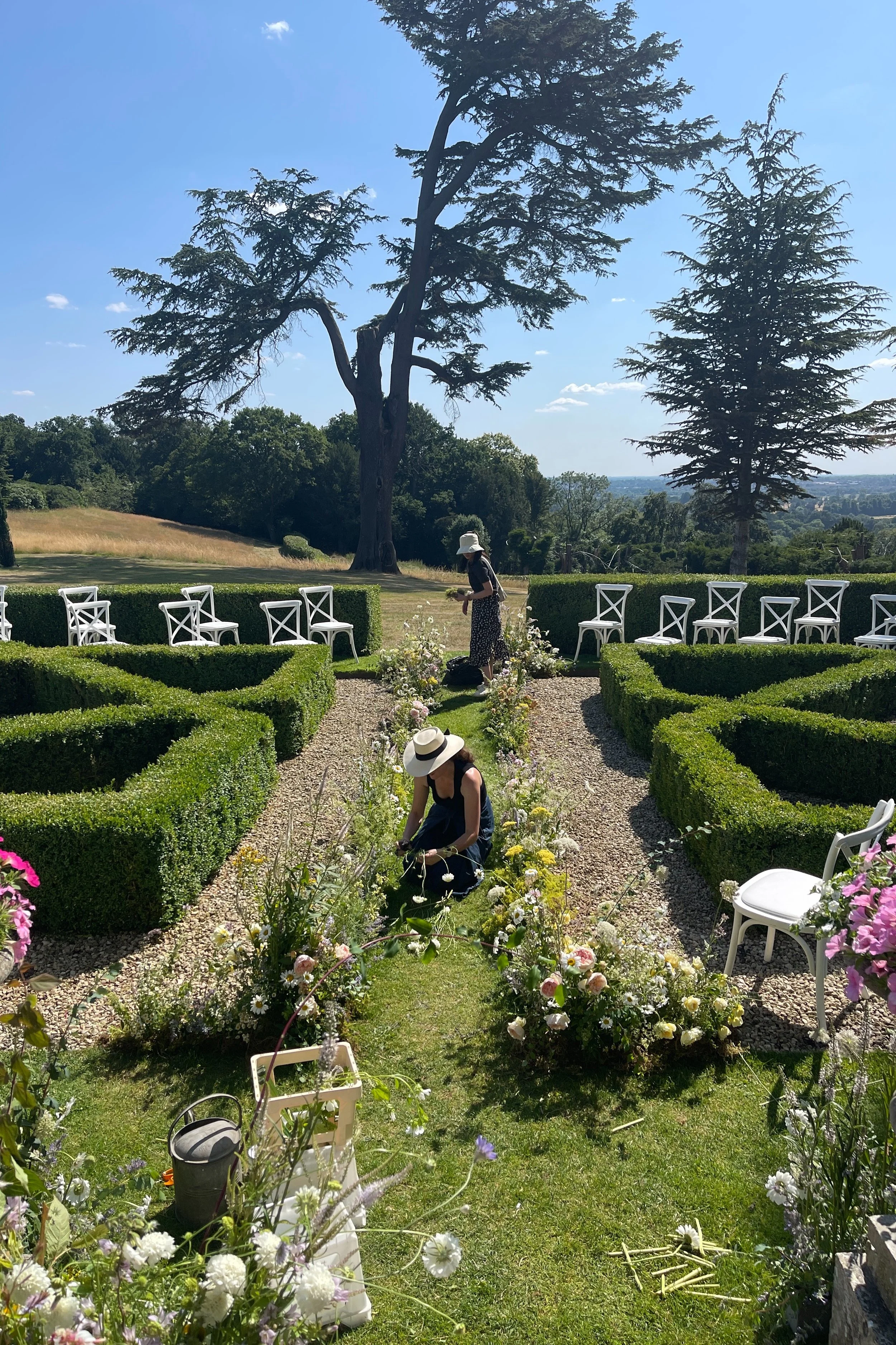 Early in the month we installed a wedding at Hedsor House for which - for once - it was a balmy 28 degrees and very windy. The ceremony was held outdoors in a small topiary garden for which we created an undulating floral border of perennials and garden roses. In the hall we wound spindly leafy branches up around the columns with honeysuckle and sweet pea vines entwined around them.