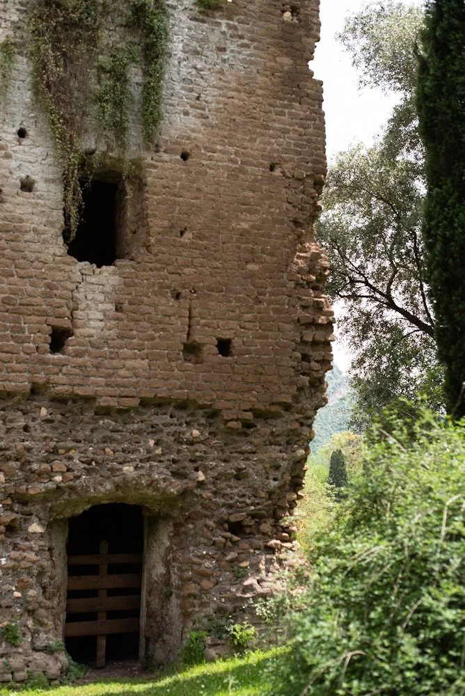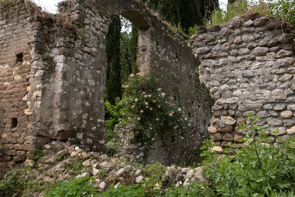 The name Ninfa derives from the island temple on the neighbouring lake, dedicated to nymphs, water deities believed by the Romans to dwell in cool springs, rivers and forests. The first documentation of the site refers to Ninfa as a resting place for travellers where they would water their horses and pay a toll. It occupied a strategic position; when the Pontine marshes flooded the Appian Way, travellers would use the foothill route, or Via Pedemontana, connecting Rome and Naples. Subsequently Ninfa formed part of a vast and richly agricultural estate owned by the church; the fortified town was built in the eleventh century and by the end of the twelfth it was a thriving community governed by various noble families. In 1297 Ninfa was given to Pietro Caetani by his uncle, Benedetto Caetani, Pope Bonifacio VIII, who, through farming, fishing and successful administration including the establishment of various mills and tanneries, further enriched the fortunes of the town and its inhabitants. At this time the lake was dammed and the abundant flow of water through Ninfa allowed the townsfolk to establish many small gardens. Throughout the thirteenth and fourteenth centuries, under the Roman Caetani family, Ninfa continued to expand and flourish; the town boasted over two thousand inhabitants, a castle and town hall and seven churches.