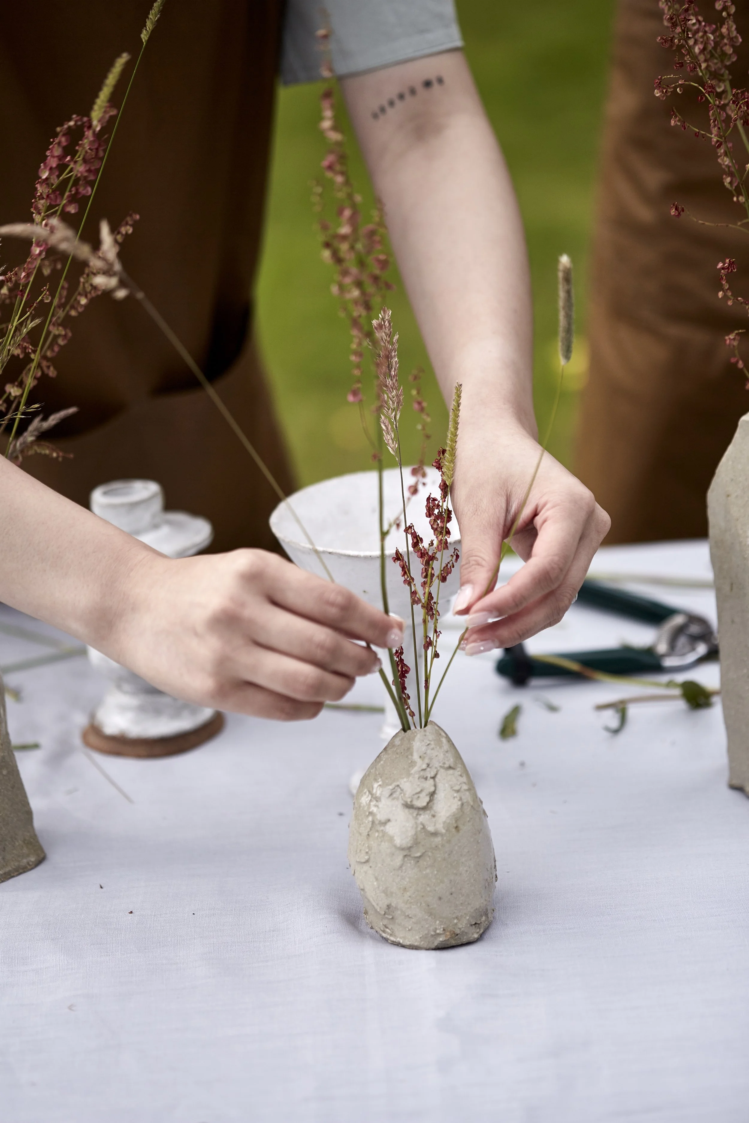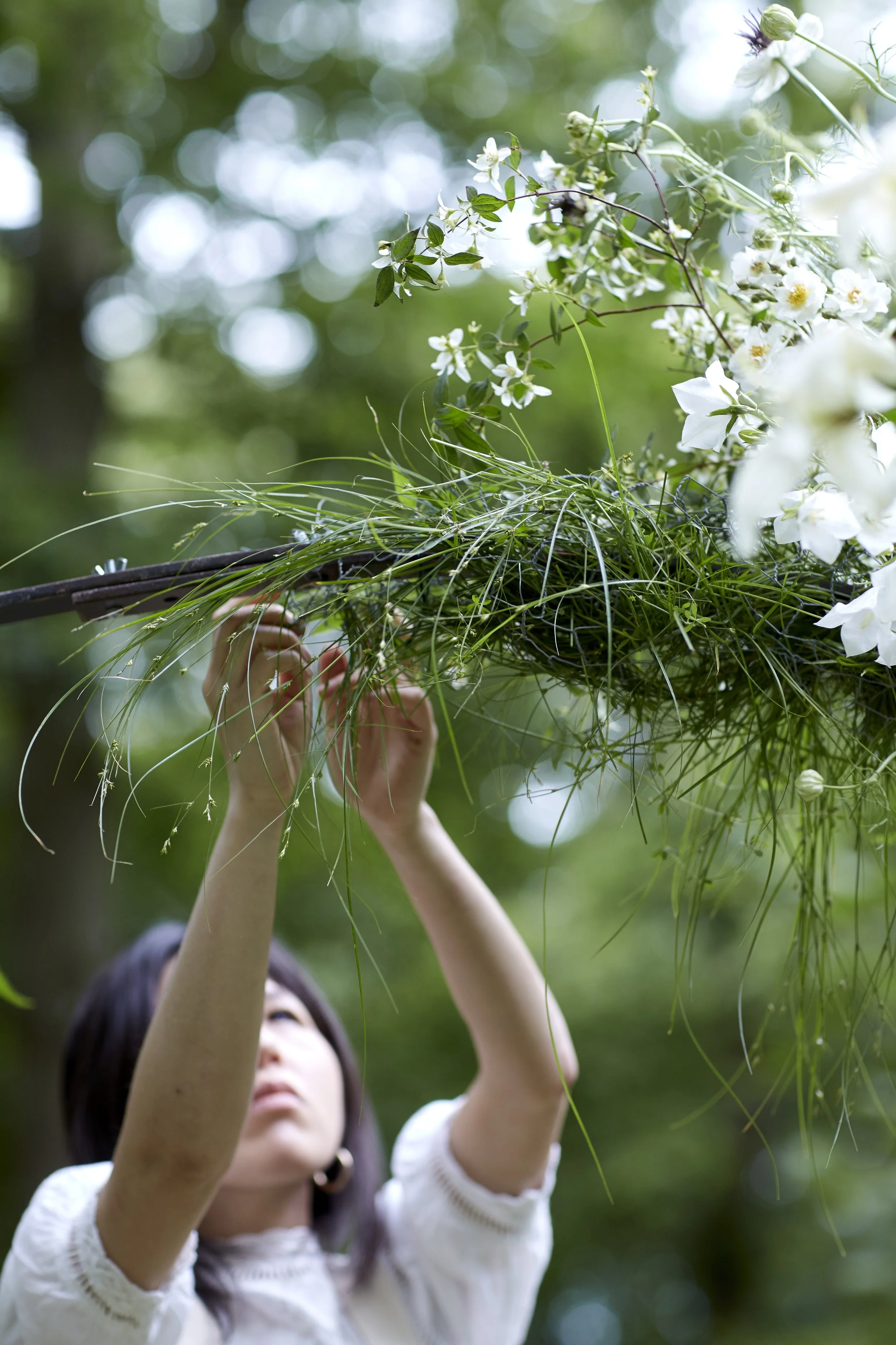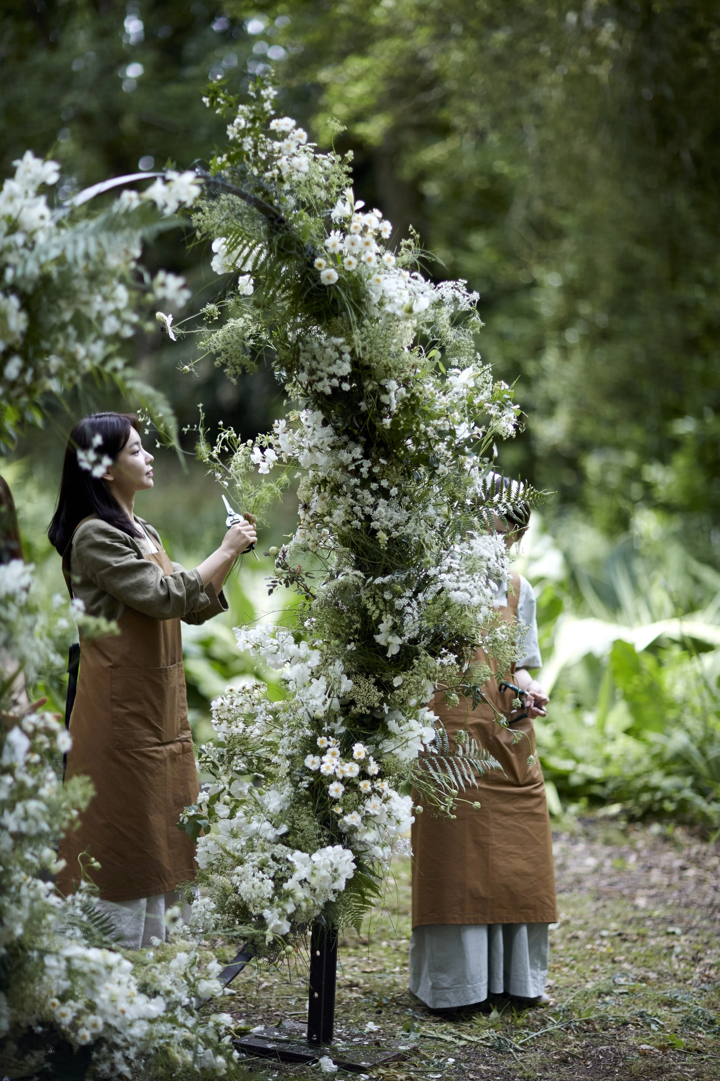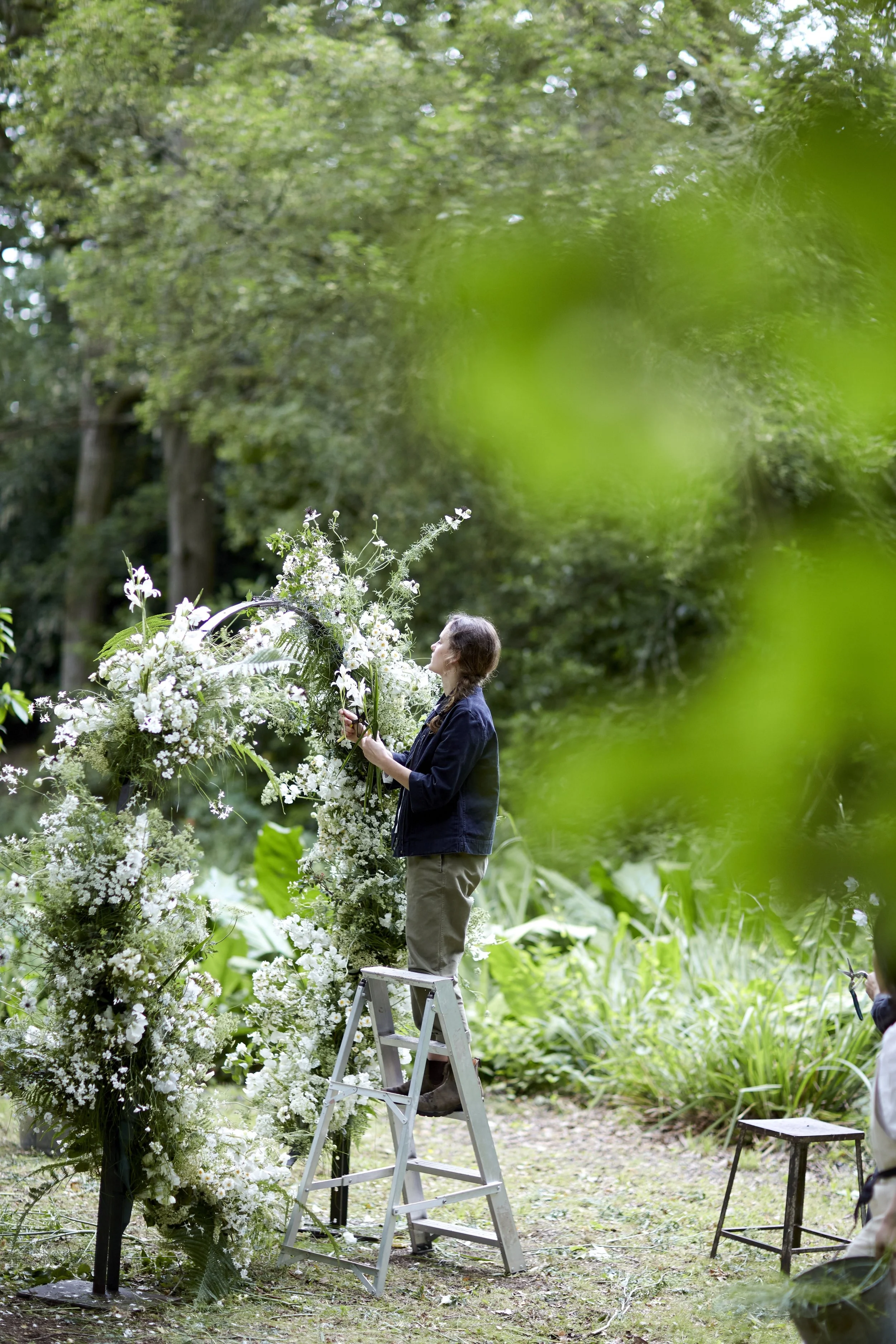 The floral design workshops were held in the beautiful glass ‘Woodshed’ and throughout the grounds including an all white installation in an ancient wooded dell of gigantic oak trees and shadowy ferns, inspired by Vita Sackville-West’s White Garden at Sissinghurst, and a tablescape of grasses and sorrel referencing the meadow in the Orchard at Dixter, using incredible ‘rock’ vases made by Noe Kuremoto Ceramics.