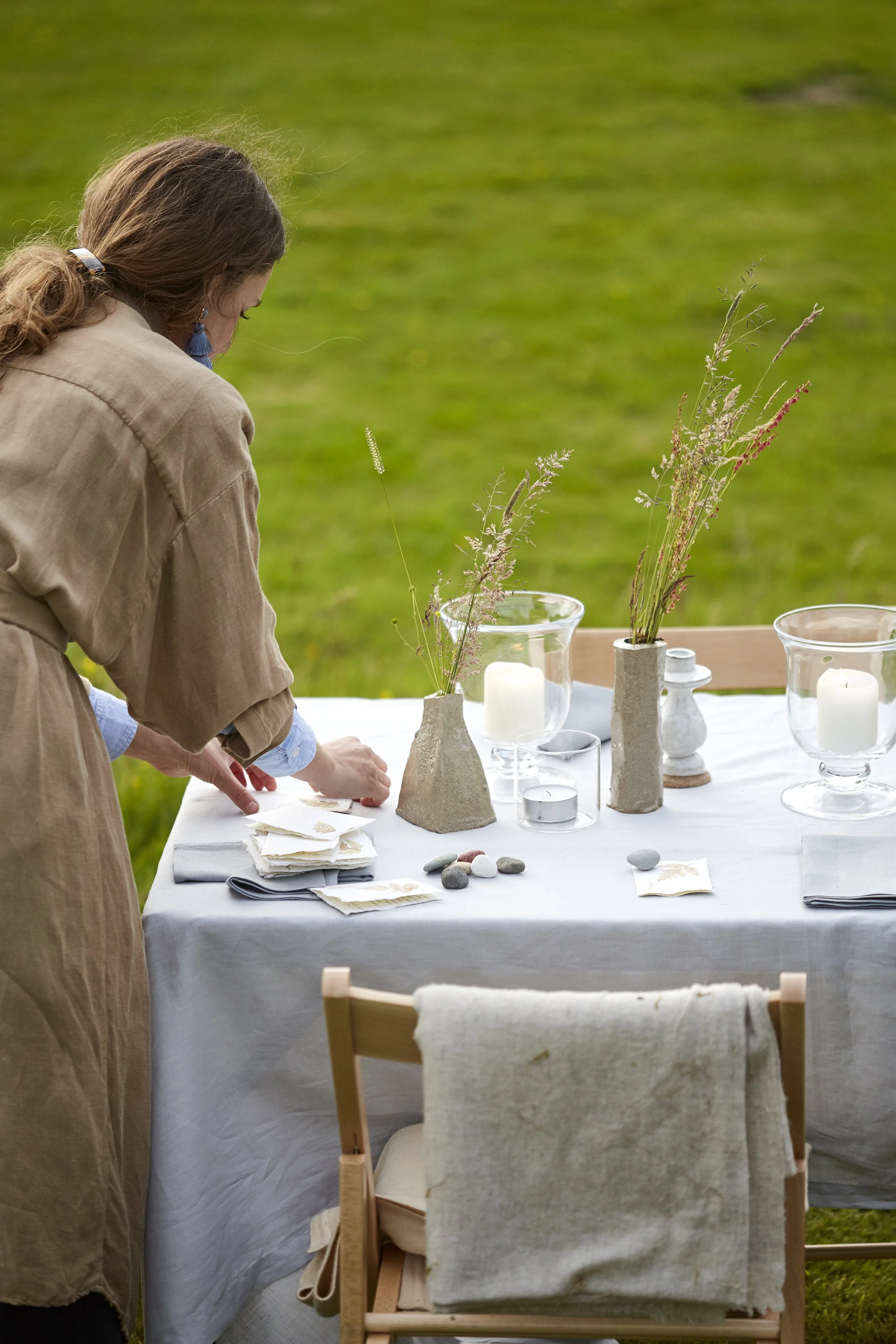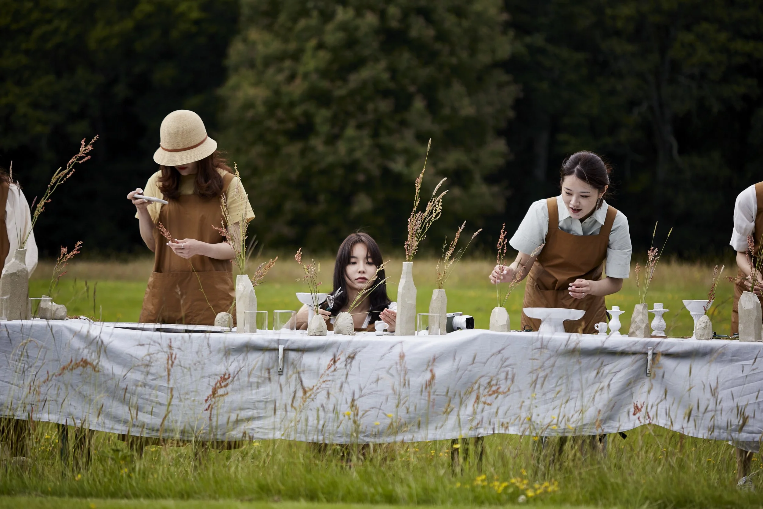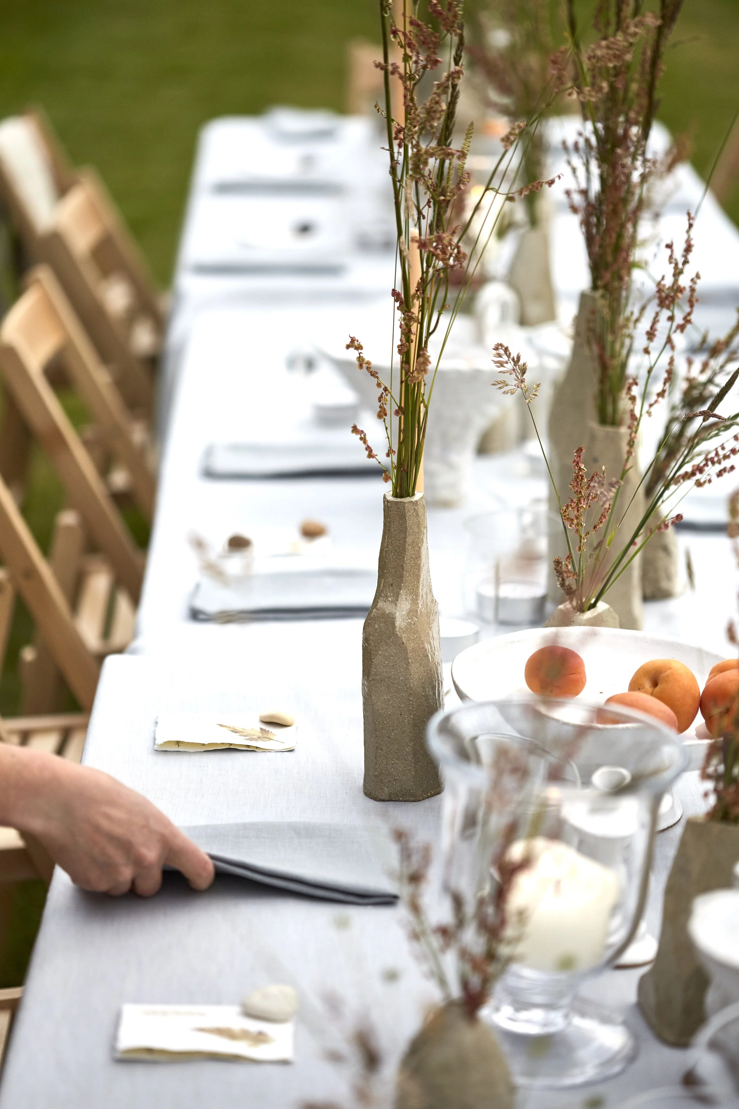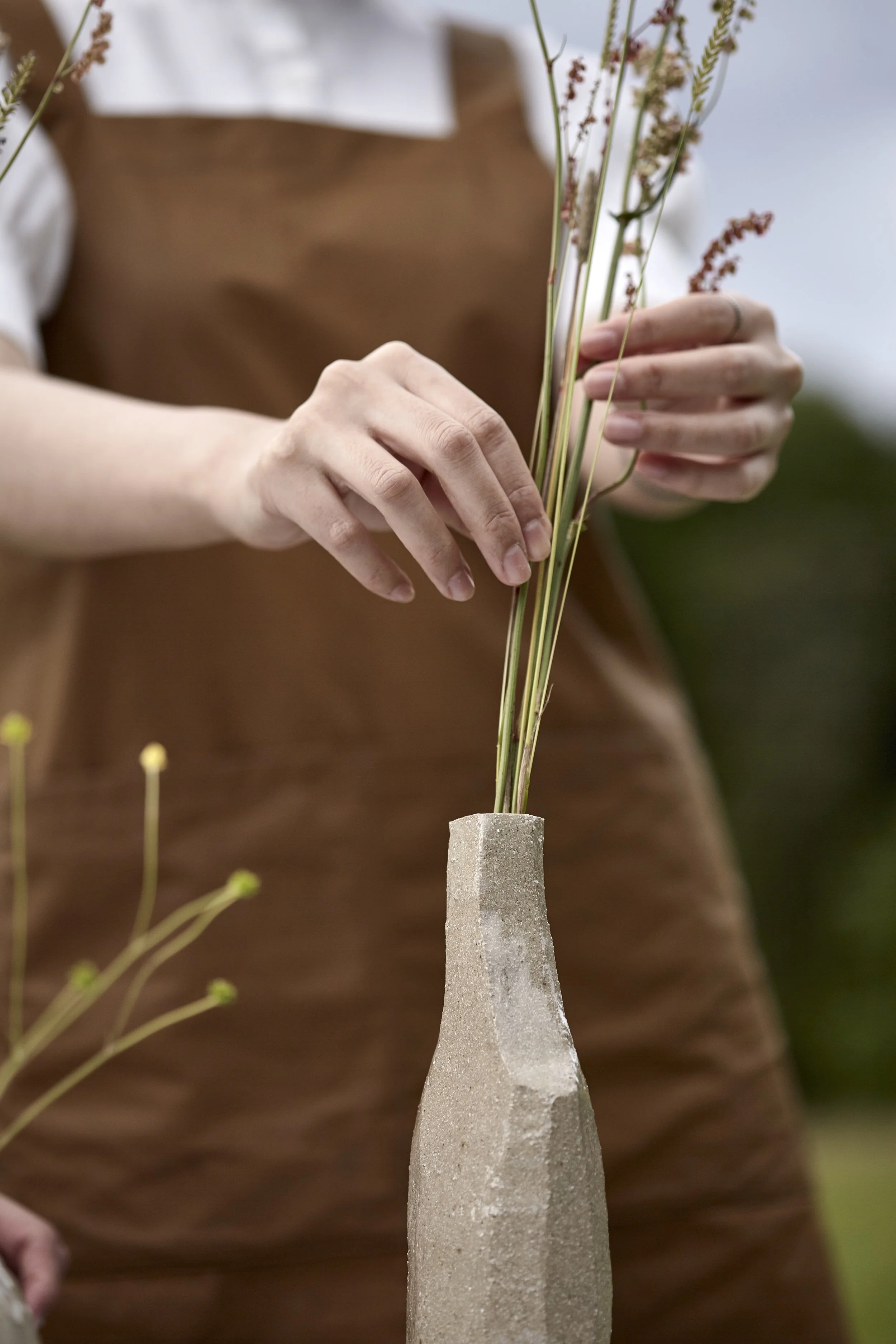 The floral design workshops were held in the beautiful glass ‘Woodshed’ and throughout the grounds including an all white installation in an ancient wooded dell of gigantic oak trees and shadowy ferns, inspired by Vita Sackville-West’s White Garden at Sissinghurst, and a tablescape of grasses and sorrel referencing the meadow in the Orchard at Dixter, using incredible ‘rock’ vases made by Noe Kuremoto Ceramics.