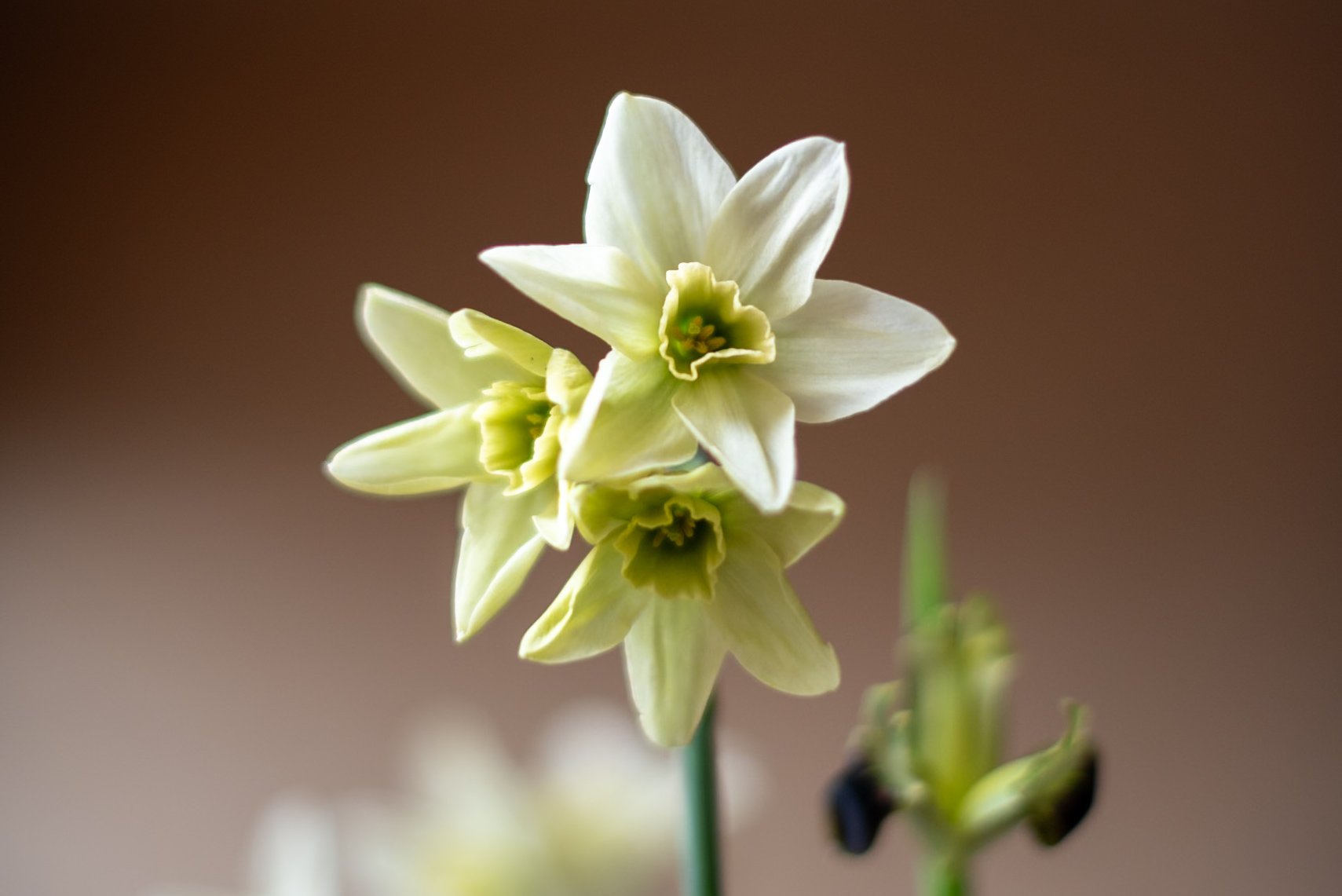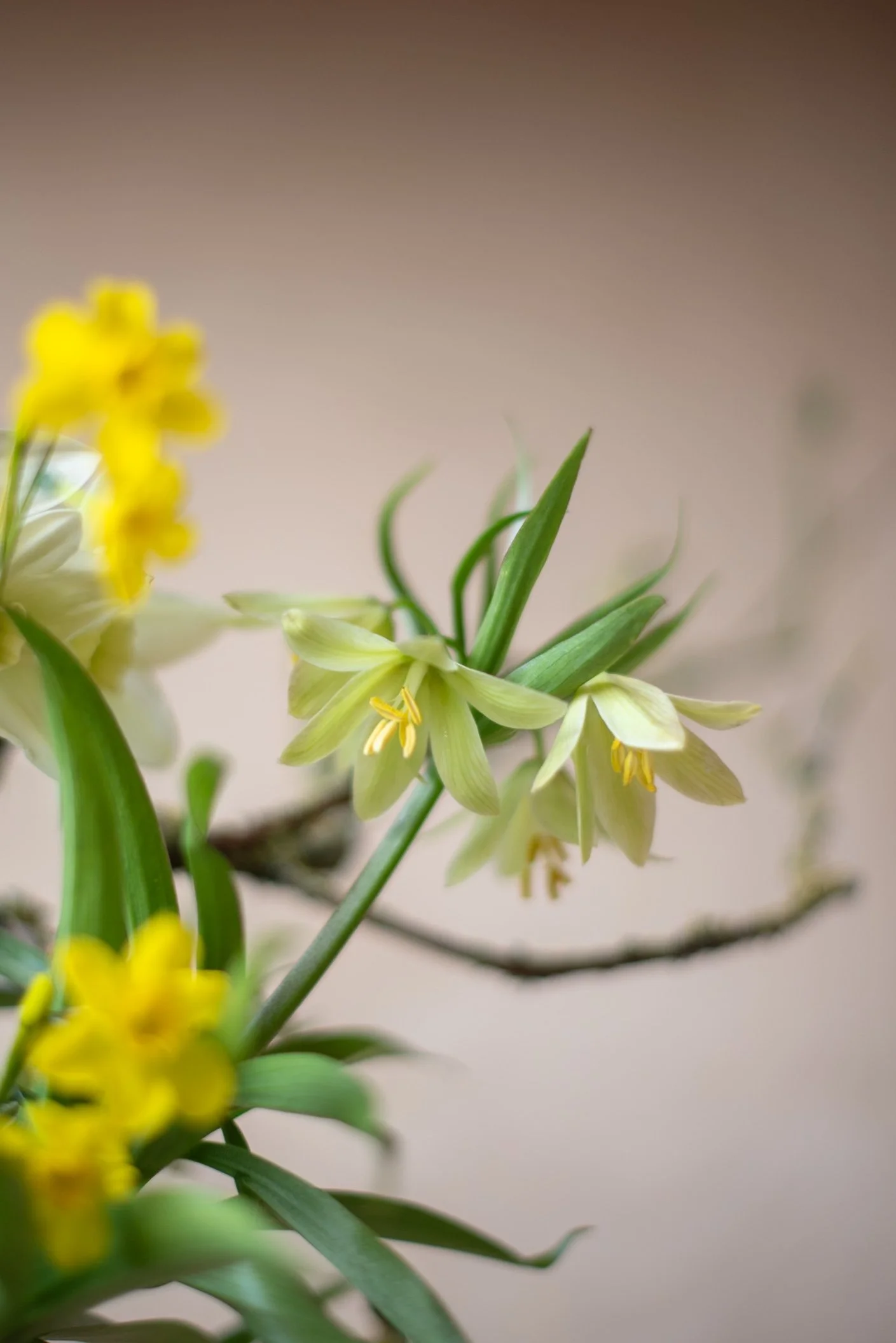 After hellebores the Narcissi are the first flowers to really start coming through from the garden in any quantity, early spring, accompanied in dribs and drabs by anemones, squill, black or widow iris and fritillaries. ‘Polar Hunter’ is among the eager frontrunners - strongly perfumed, long stemmed, multi-headed in a green-tinted white. I’ve paired it with the miniature Fernandes daffodil - a fragrant jonquil variety with much smaller flower heads and shorter stems. But this confident little flower seems to hold her own, especially in clusters. The golden petals are slightly curved and twisted, warranting a closer look and then you catch the scent… I like the way the grey, lichen-draped rose stems and the velvety brown iris keep the arrangement muted - it feels very capricious and early spring to me - moments of warmth and sunny exuberance tempered by scudding clouds and a sudden hailstorm.