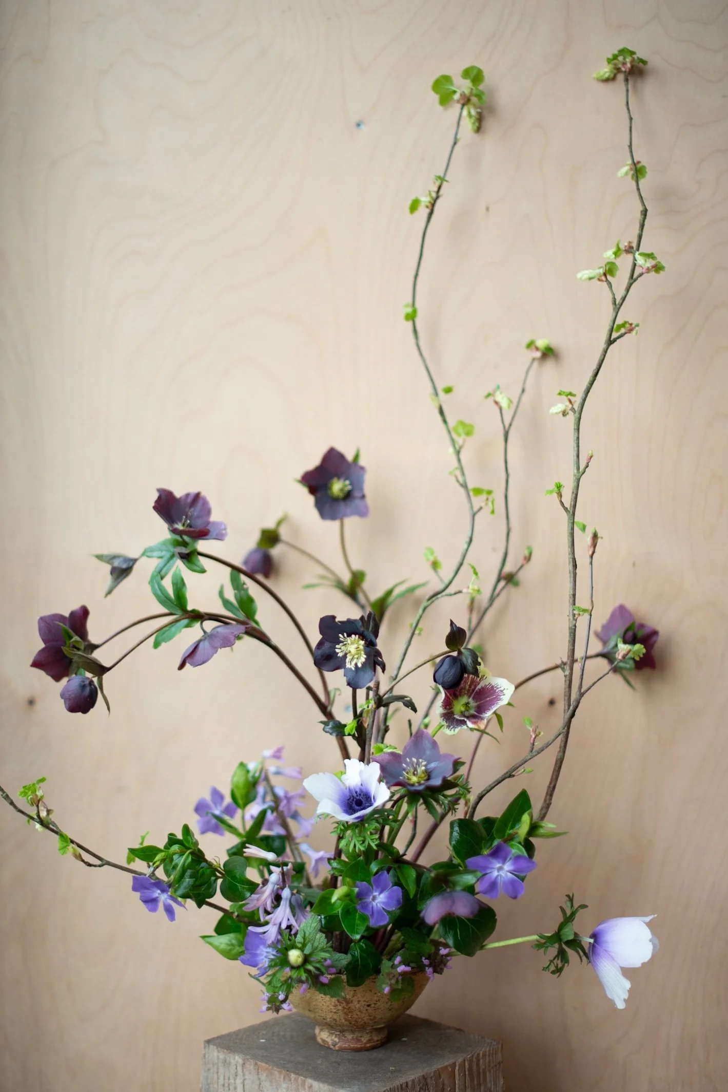 How delicious it is to handle these vibrant blues and purples after the long winter! At this time of the year I crave colour but find that I tend to err towards palettes that are analogous or tonal. It’s as though a greater contrast would be impolite, somehow - jumping ahead too quickly. Better to ease into the season with tentative exploration and reacquaint ourselves! Green, though, especially the soft limes and rich mid-greens that begin to appear March onwards - these are a good way to keep the composition balanced and refreshingly leafy. I had originally envisaged using a miniature daffodil as a complementary pairing to the violet periwinkle but often with yellow I find that this has already been provided by the stamens and the way the light fell on the pendant-like currant flowers and the mustard centres of the hellebores seemed sufficient so I set the yellow daffs aside for another day. The dead nettle is a herbaceous perennial weed that crops up around the garden and we’re rather fond of - it’s pretty, a useful ground-cover in the garden and filler in arrangements, and ecologically valuable, providing nectar for bees when there are few other sources around.