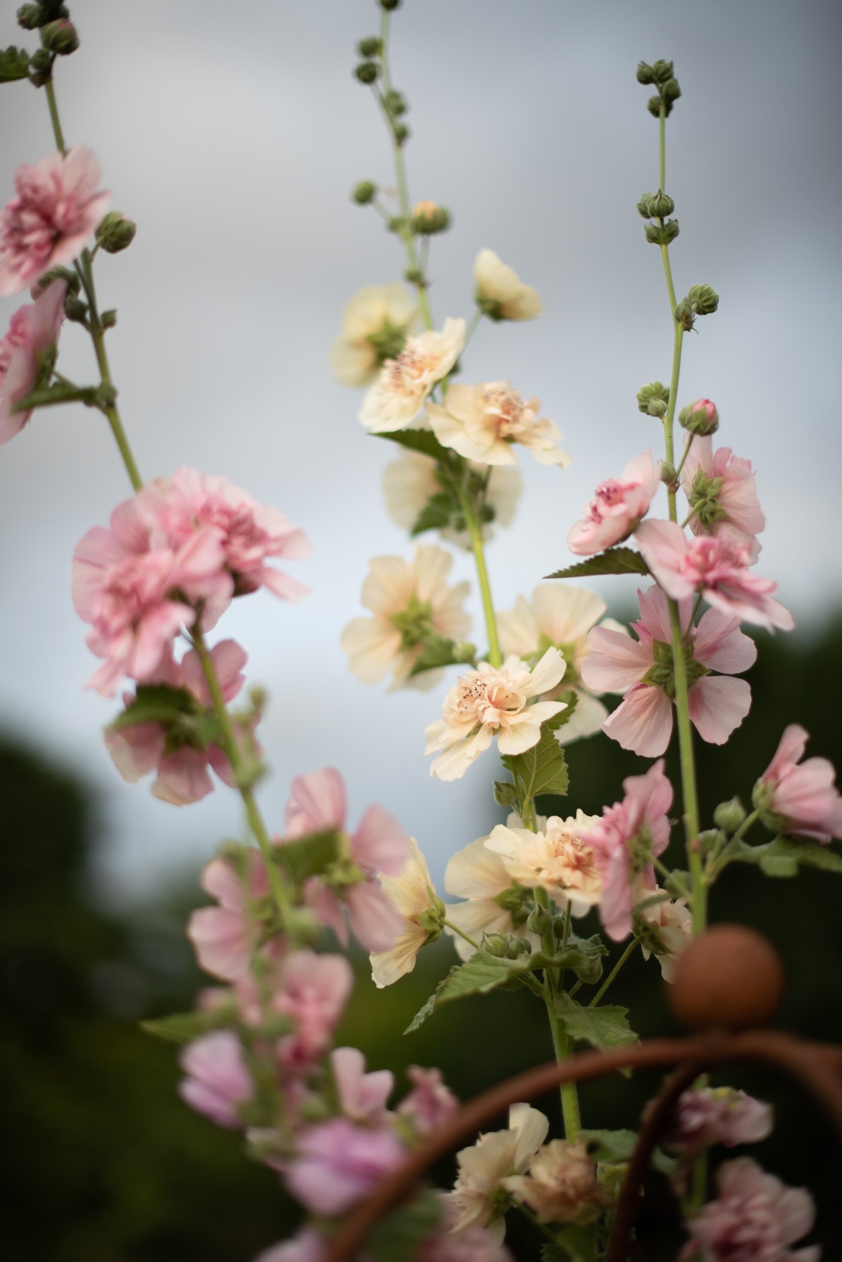 The Alcalthaea are a cross between a hollyhock and a mallow; they have greater rust resistance (allegedly) than a hollyhock and flower right through from mid-summer to the first frost. Very tall stems bear bowl-shaped flowers sprinkled with bronze stamens. We sear them immediately once cut for around 40 seconds in just-boiled water and find that they last extremely well in a vase.