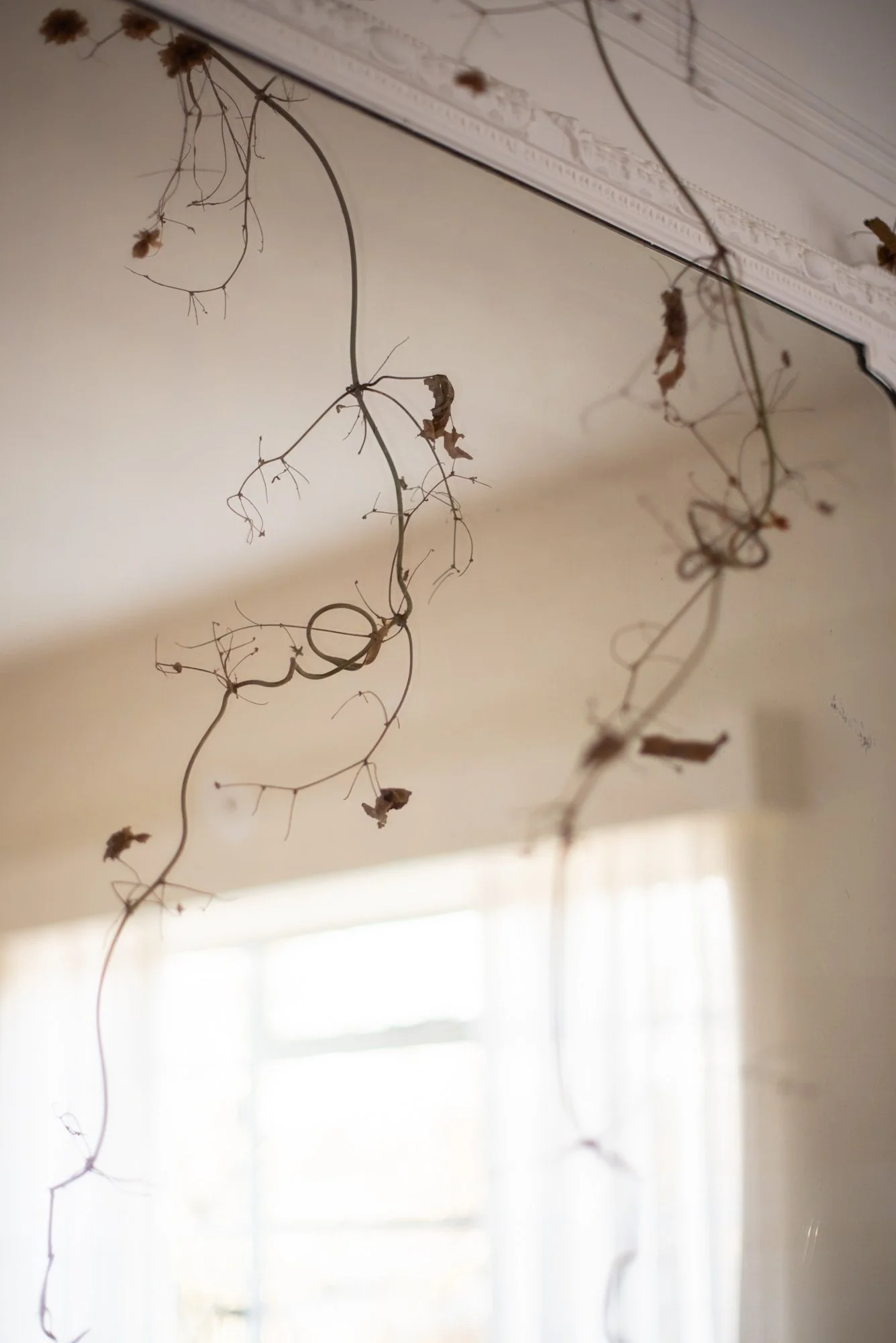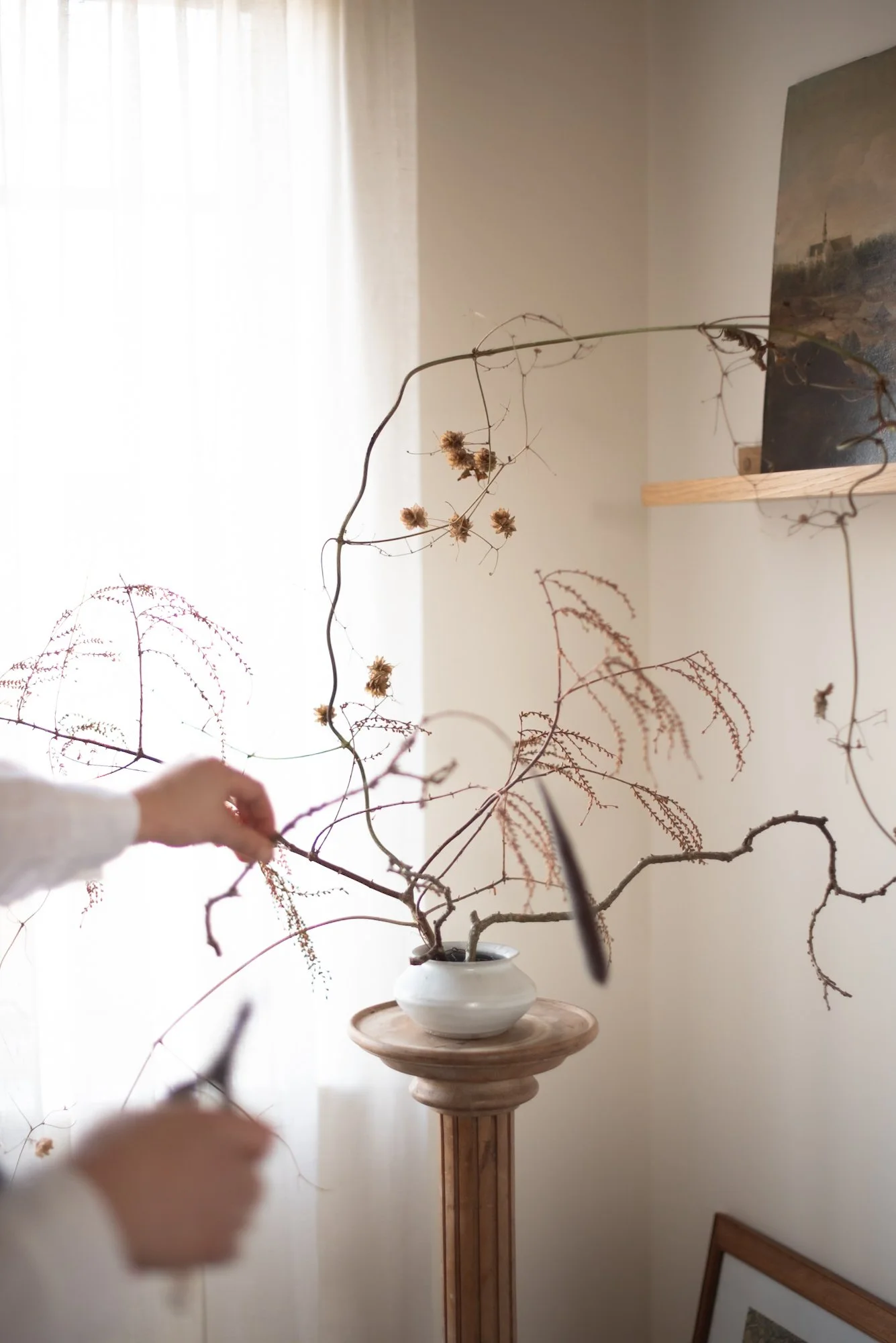 The hops vine is trimmed and edited of dross foliage and straight stems leaving beautifully long, curving stems which are fixed directly onto the kenzan to provide a scribbly outline shape. I choose one single redwood branch with a forked stem and add the wisteria branches short to allow their exquisite seedpods to hang down ovbe rthe front and sides of the bowl. Cyclamen and wispy stems of variegated ivy are gently layered into the water between the branches for a naturalistic ‘ground cover’ effect.