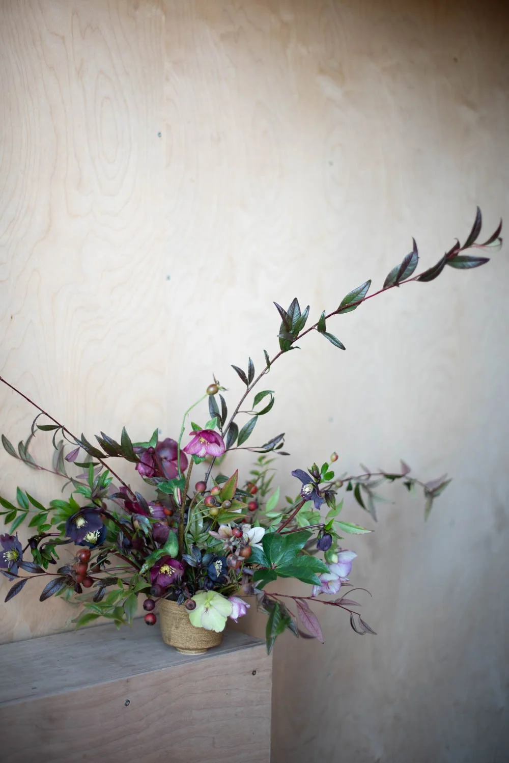 In this simple arrangement I used several different varieties of hellebore in a gradation of colour from light to dark. To keep it uncomplicated in the foliage department I picked two different foliages - slim, arching branches of cotoneaster for shape and structure and sacred bamboo as a filler - specifically chosen for the elegance of the leaf shape, which are both oval with pointed tips and the colour, suffused with a dusty red darkening to maroon. The hellebores were seared in boiling water for 30 seconds to prevent them from wilting and arranged onto the kenzan by variety, starting with the palest: a picotee snow rose which is a bicolour white and pink, followed by the creamy Lenten rose ( x ballardiae named after the '“Queen of the Hellebores”, Helen Ballard who crossed Helleborus niger with Helleborus lividus to produce a number of our favourite varieties including this one (‘Maestro’) as well as ‘Merlin’ and ‘Camelot’, all of which we have around the garden and plan to consolidate together in our part-shade ‘Wabi-Sabi’ area. I like the look of ‘Pink Frost’ too - on the ever-lengthening plant wish-list!